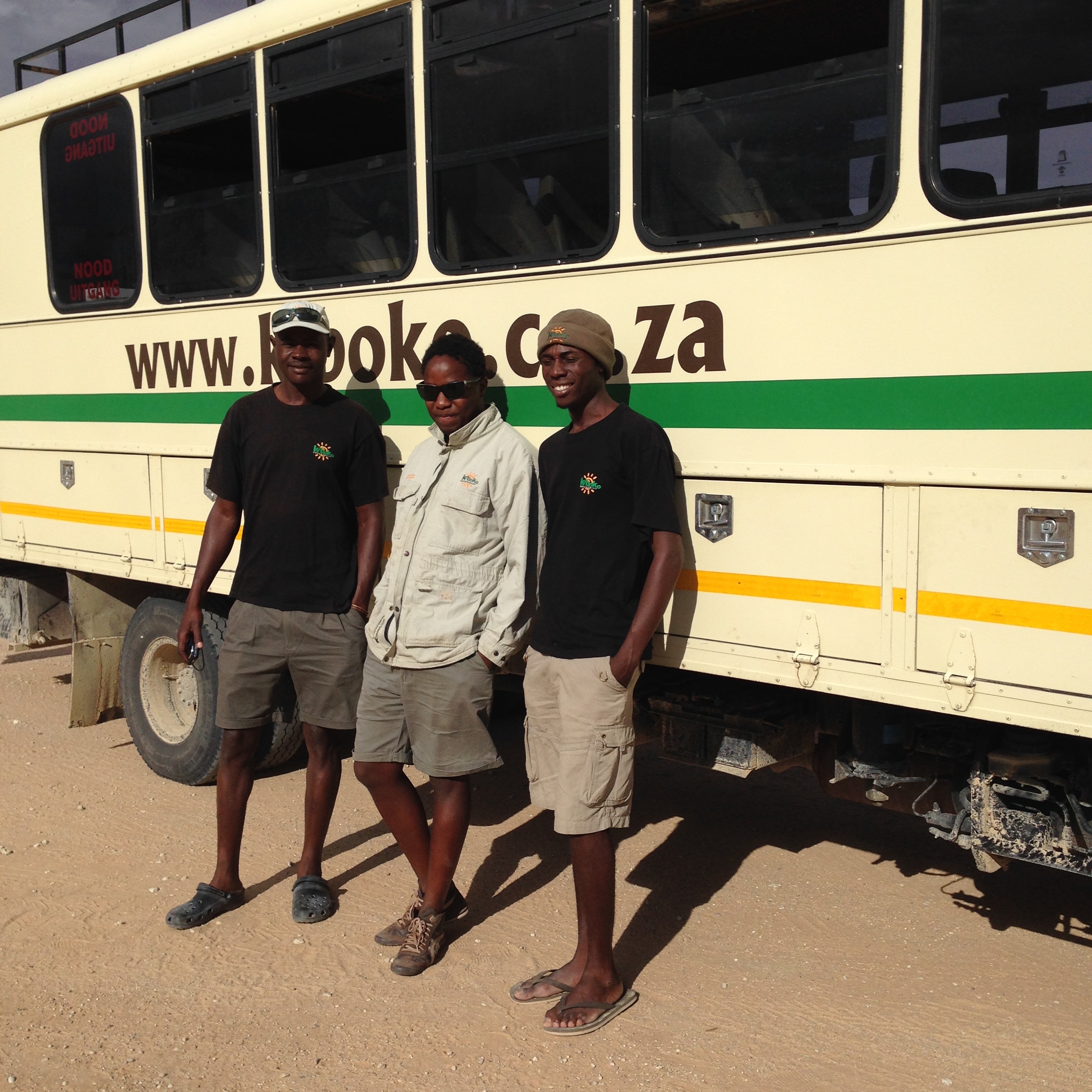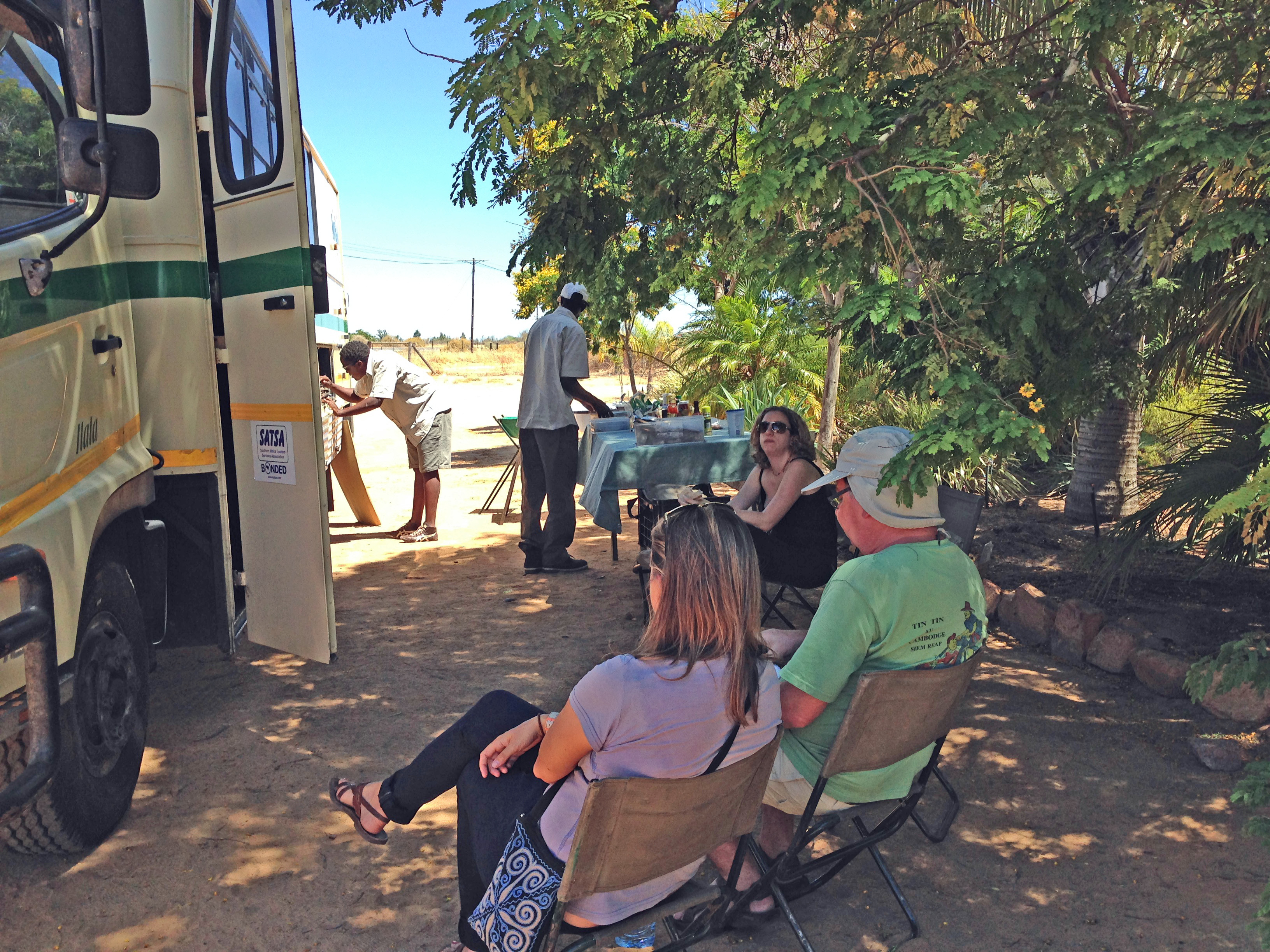 To begin with we were a group of 8: Mike and I from Bahrain, Anne from France, Rachel from the USA, Jan from the Netherlands and our crew – leader, expert driver, historian, geologist and more, Dumi; Richard, expert on birds, wildlife, jokes and good times; and Mandla, chef extraordinaire – all three from Zimbabwe and all three members of the Ndebele tribe which originated from the Zulus. We were all fascinated with the different clicks in their language and tried with hilarious results to copy them. (In order from L – R in the pic: Dumi, Richard, Mandla.)