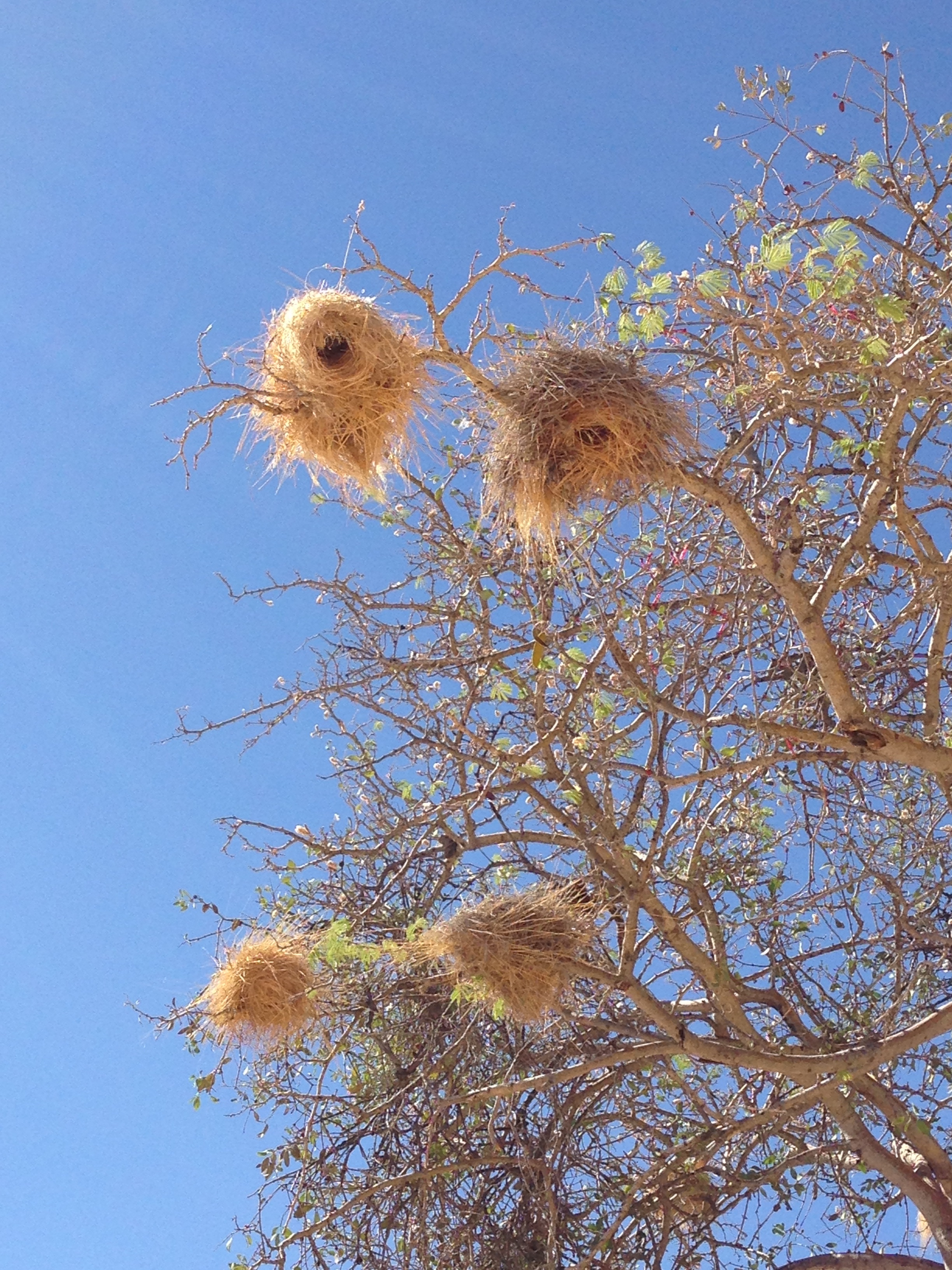 I have been seeing lots of acacia (camel thorn) looking trees with multiple nests. These are the nests of the masked weaver bird. The male builds a nest to attract the female. She must approve of the nest and enter it and look around. If she doesn’t approve then the male must build another one. The female must be pretty picky because these trees have so many failed nests of which only one is being used! Dumi explained to us that the nests, for the most past, are built by the on the west side of the tree, therefore providing a directional guide for desert travelers.