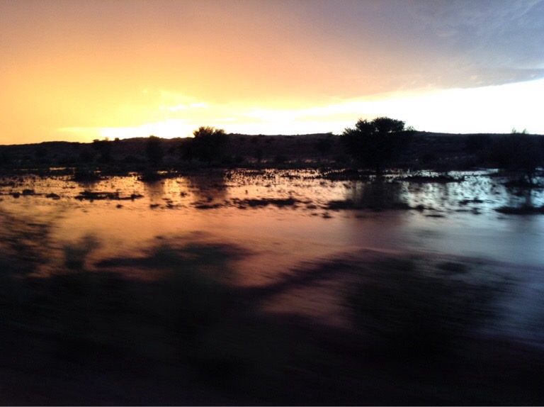 Because we went on an early morning game drive at 530 am, we didn’t follow the usual morning routine. First of all, we were woken up by a thunder and lightning display with heavy rain and then, a spectacular sunrise! Water water everywhere! What had been dry during the afternoon game drive of the previous afternoon, became a lake.