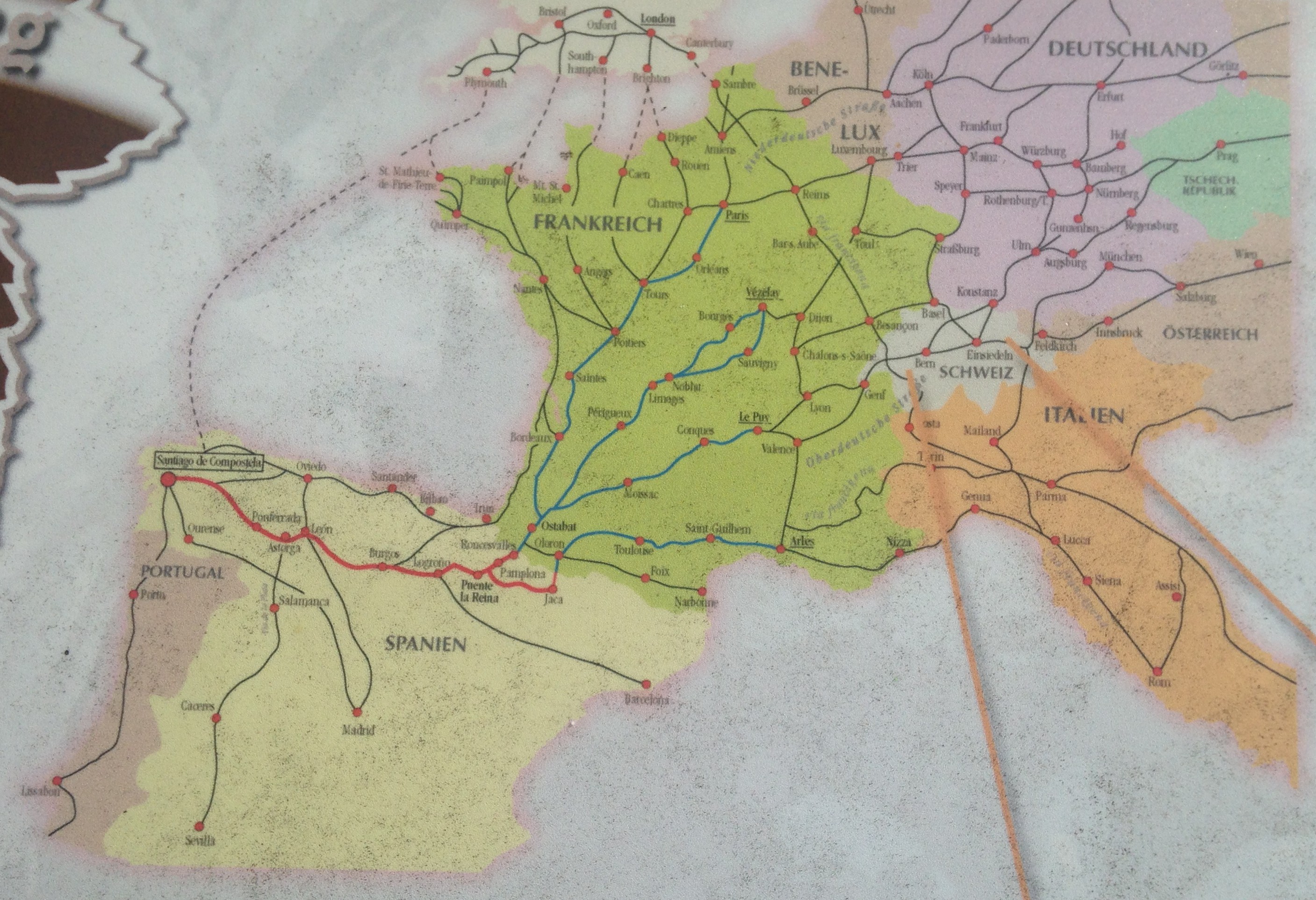 And since France lay between Santiago and Switzerland, it would also have to be crossed. It would be 2340 km from Konstanz, Germany through Switzerland to the French border east of Geneva, then through France to the Spanish border and thence to the Compostela de Santiago… a long, long journey…. taking over 3 months.