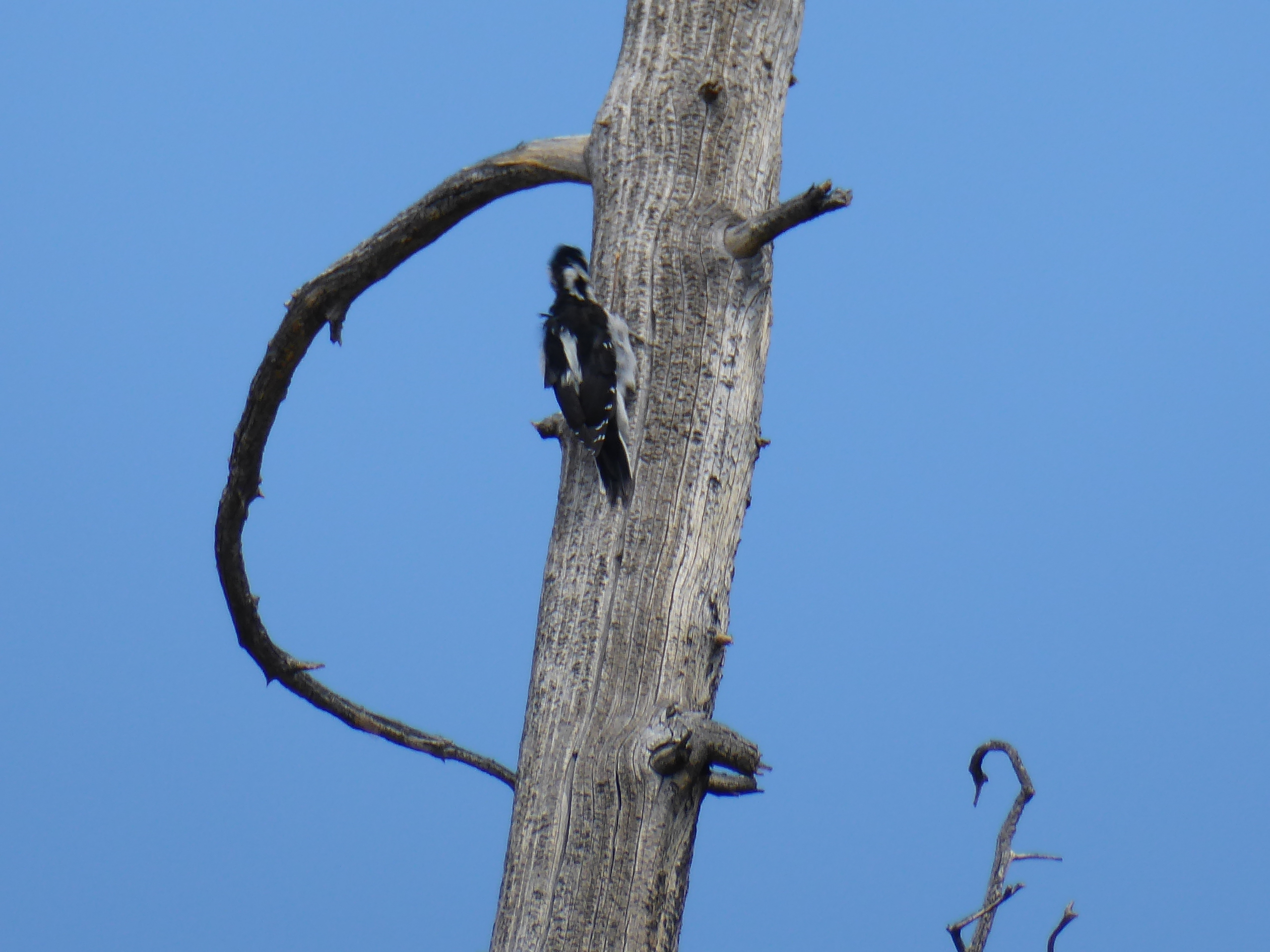 As we were close to completing a full circuit of the lake, we came upon a stand of dead trees. I wouldn’t have stopped except for the tap – tap – tap of a foraging woodpecker. Sure enough there he was, working hard at his drilling job.