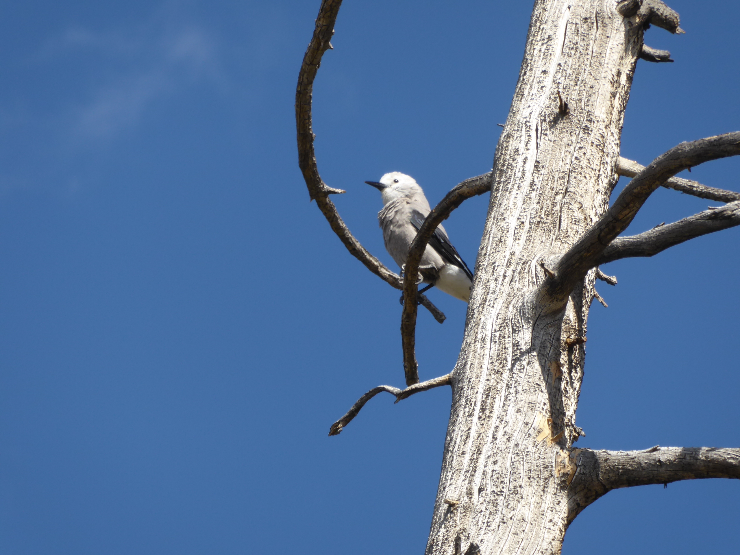 We docked ourselves on a couple of water logs, and started taking pics. Of course, that attracted the Clark’s Nutcrackers or Camp Robbers to you Wyoming people, curious as always to see who was invading their space and if perhaps, there might be some easy pickins’ involved.