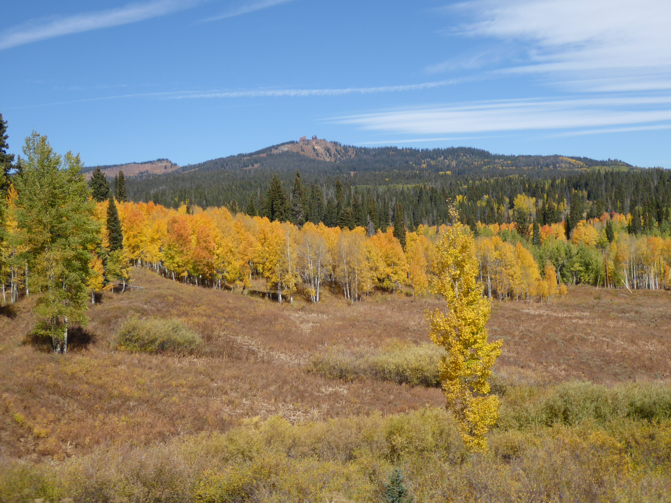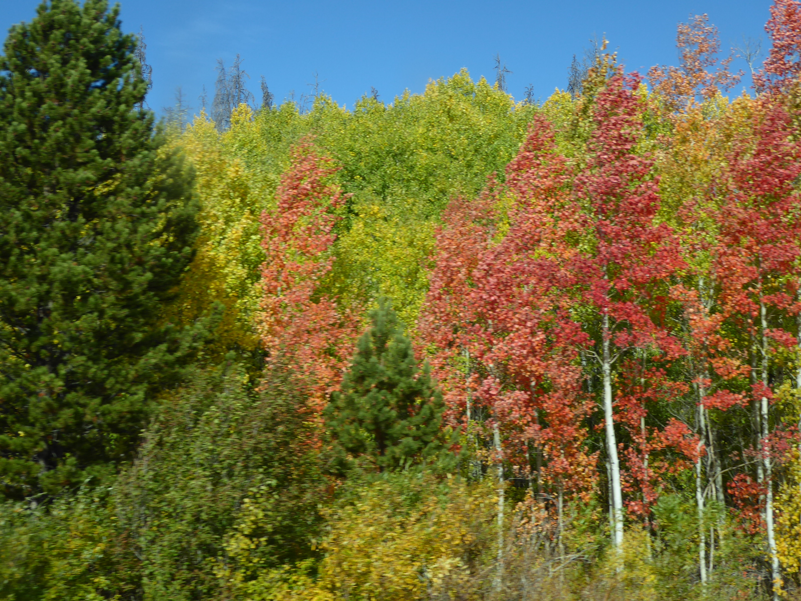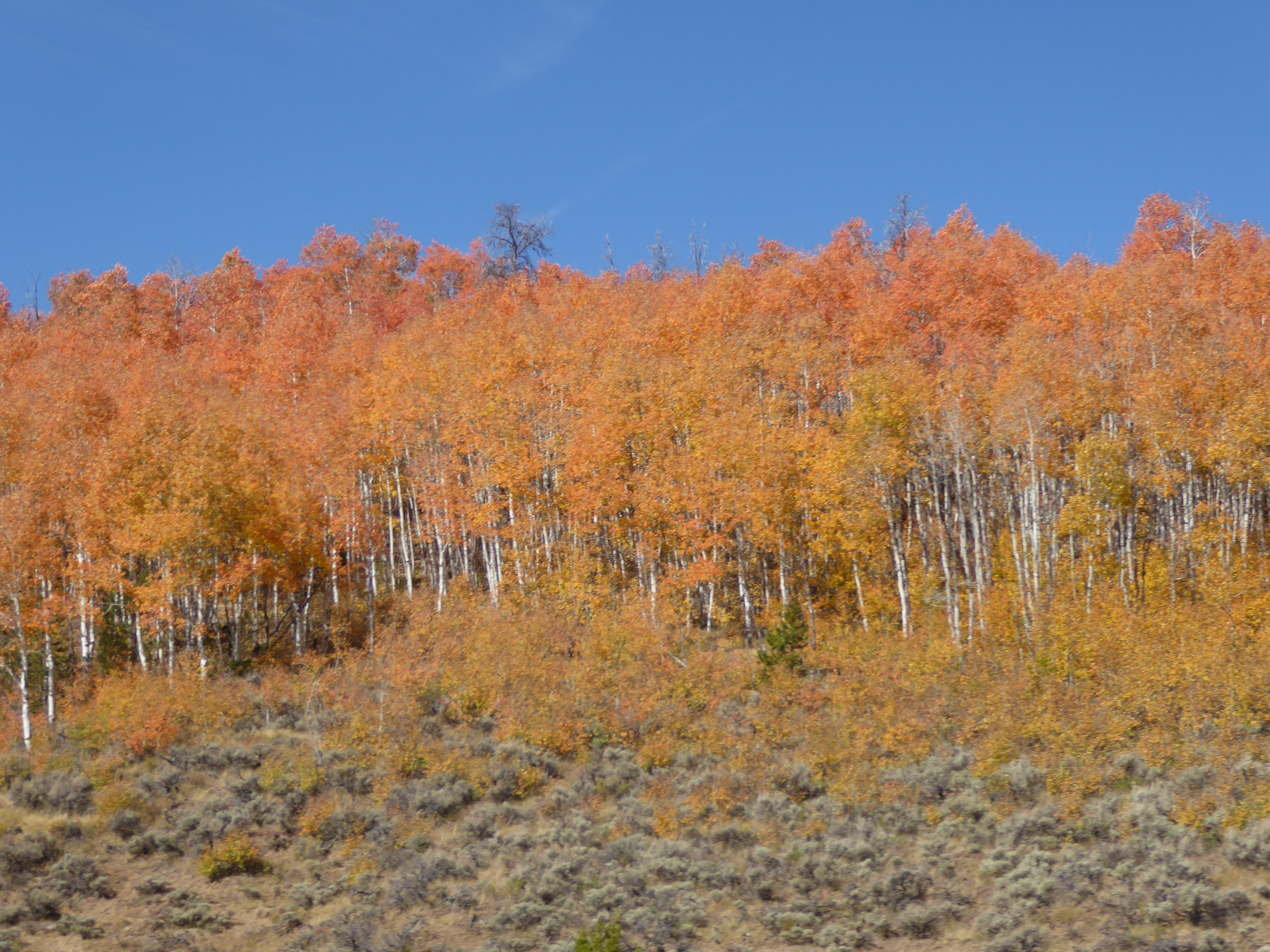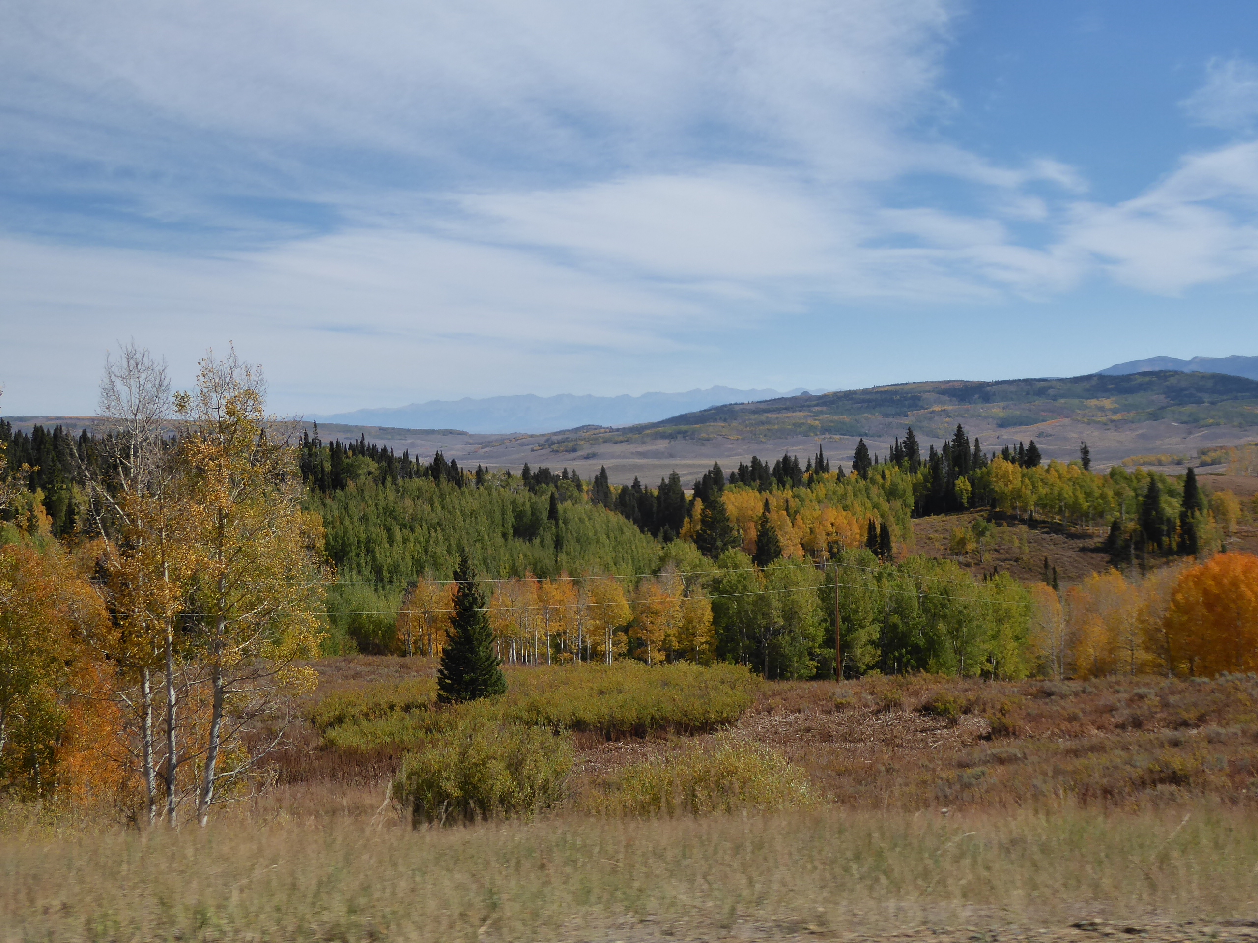 After our final hugs and kisses with the Princess and her family, and preparing the ‘little house on wheels’ for departure, we set off on the first leg of our journey back to Indio, California. We traveled via Woods Landing & Jelm, into Colorado before passing through Walden, Steamboat Springs, Craig, Meeker – finally arriving in Rifle mid – afternoon. The entire trip was a non-stop feast for the eyes….the leaves were changing, treating us to a symphony of yellows, bright and burnt oranges, scarlet and burgundy reds all set against a background of blue sky and all of the hues of green imaginable. Spectacular. Autumn in the Colorado Rockies. John Denver’s “Rocky Mountain High” kept playing in my head, over and over, for the whole trip. Here are just a few of the scenes from today: