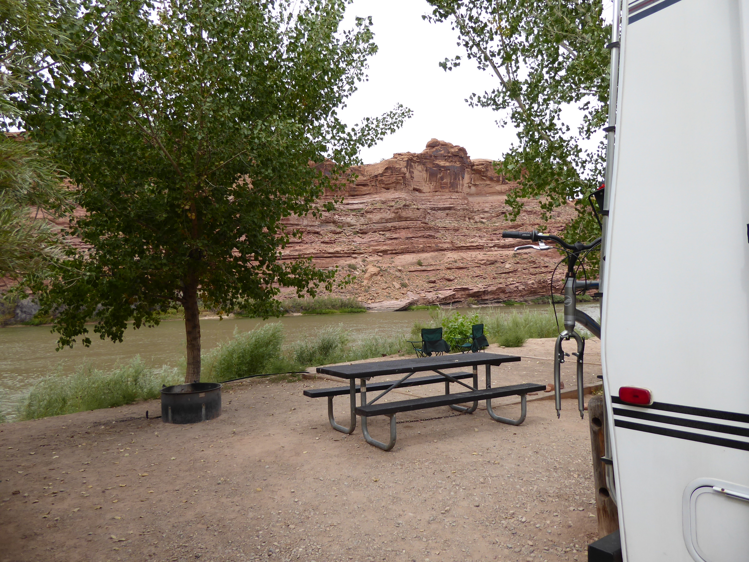 We saw the turn-off to Arches but we were focused on finding a place to camp and continued on. That’s when the “CHALLENGES’ kicked in. Up to this point, all was calm and peaceful. We traveled along the Colorado River where there were numerous campsites. However, they were not well-marked and they were not very specific as to where the tent sites were, when there were dead-ends….well, suffice it to say, after coming across a lot of ‘occupied’ sites and feeling a bit blue, we thought we spotted an available site and enthusiastically turned down one, narrow gravel road. To my MY HORROR, it turned out to be a dead-end…..my worst nightmare. Michael had to back our 24 foot fifth wheel out of a very tight spot. He was magnificent….I was a total wreck….a nervous, bloody basket case. But still, I managed to direct him out with no mishaps. The problem with these campgrounds was that they were all marked “FULL” and they were not well signed so by the time we saw the entrance, we were already too far past it to enter. Finally, we’d both had enough and decided to head into Moab and pay the exorbitant rates at one of the RV parks (of which there were many). Returning the way we’d come, we passed one of the campsites we’d missed and saw some available sites but, once again, too late….we’d passed it. This time though, there was a pull-off. Due to the ‘rush for sites’, after we found a suitable, available site, I sat and held it while Michael adroitly turned around the fifth wheel, kayaks and all, in the middle of the secondary highway he was parked on and just as adroitly backed into our site. Hugs and kisses were in order for my Michael.