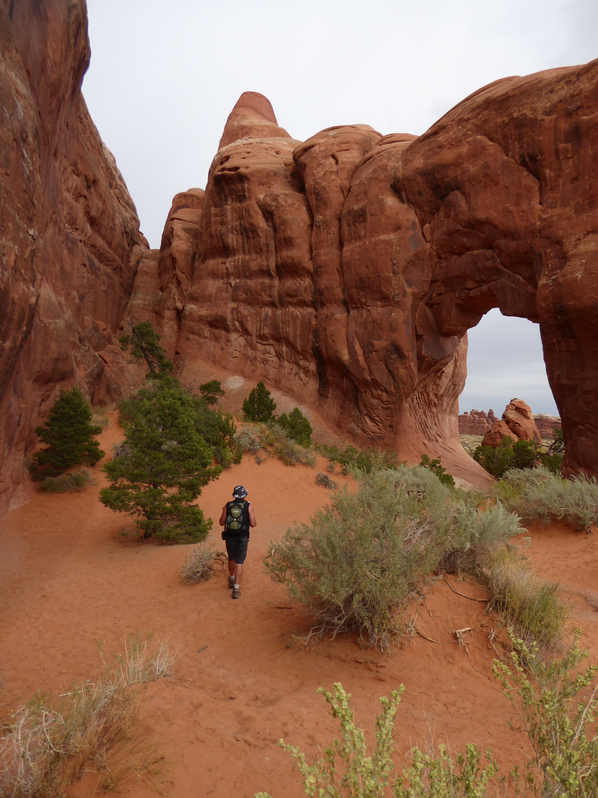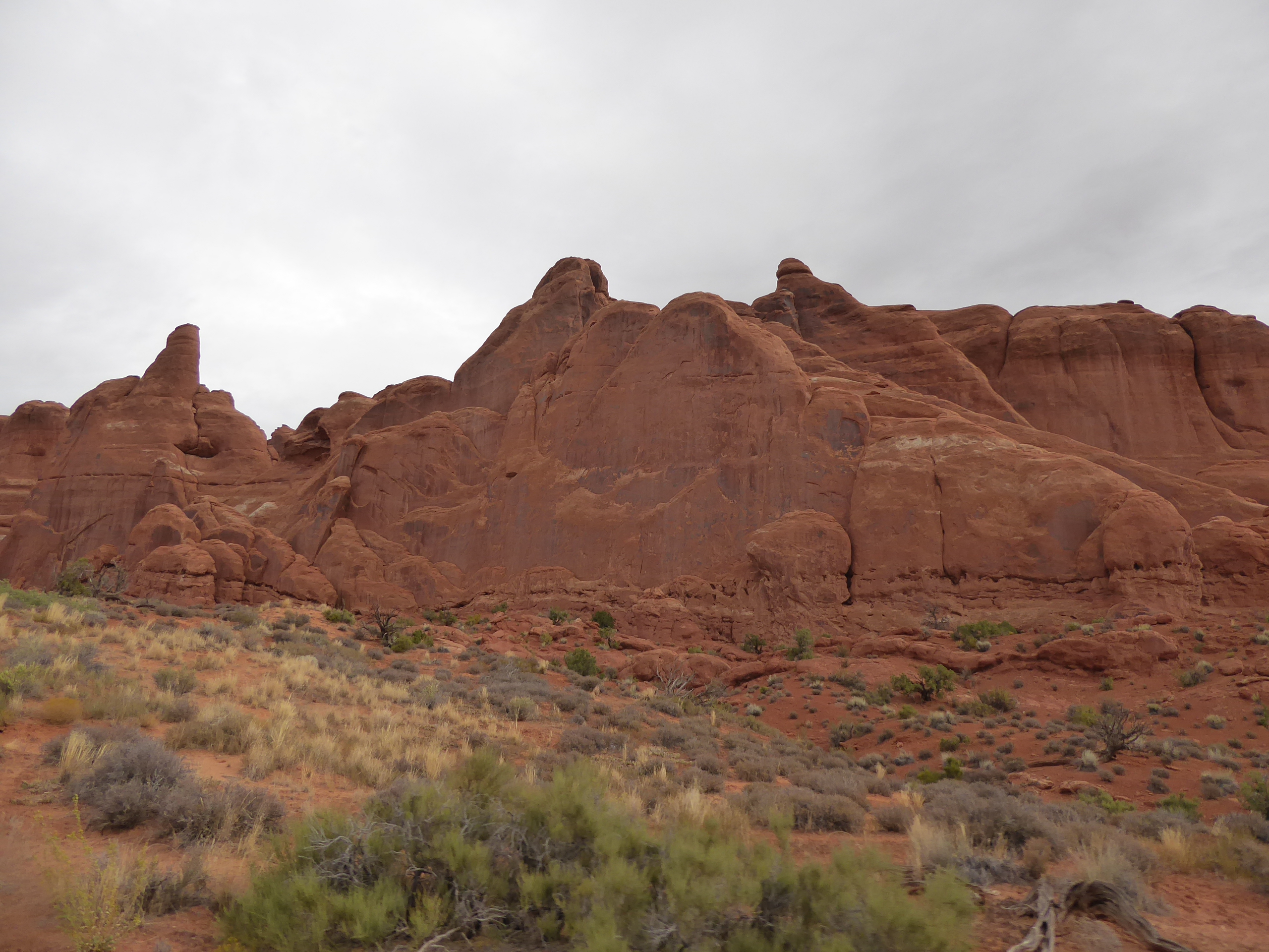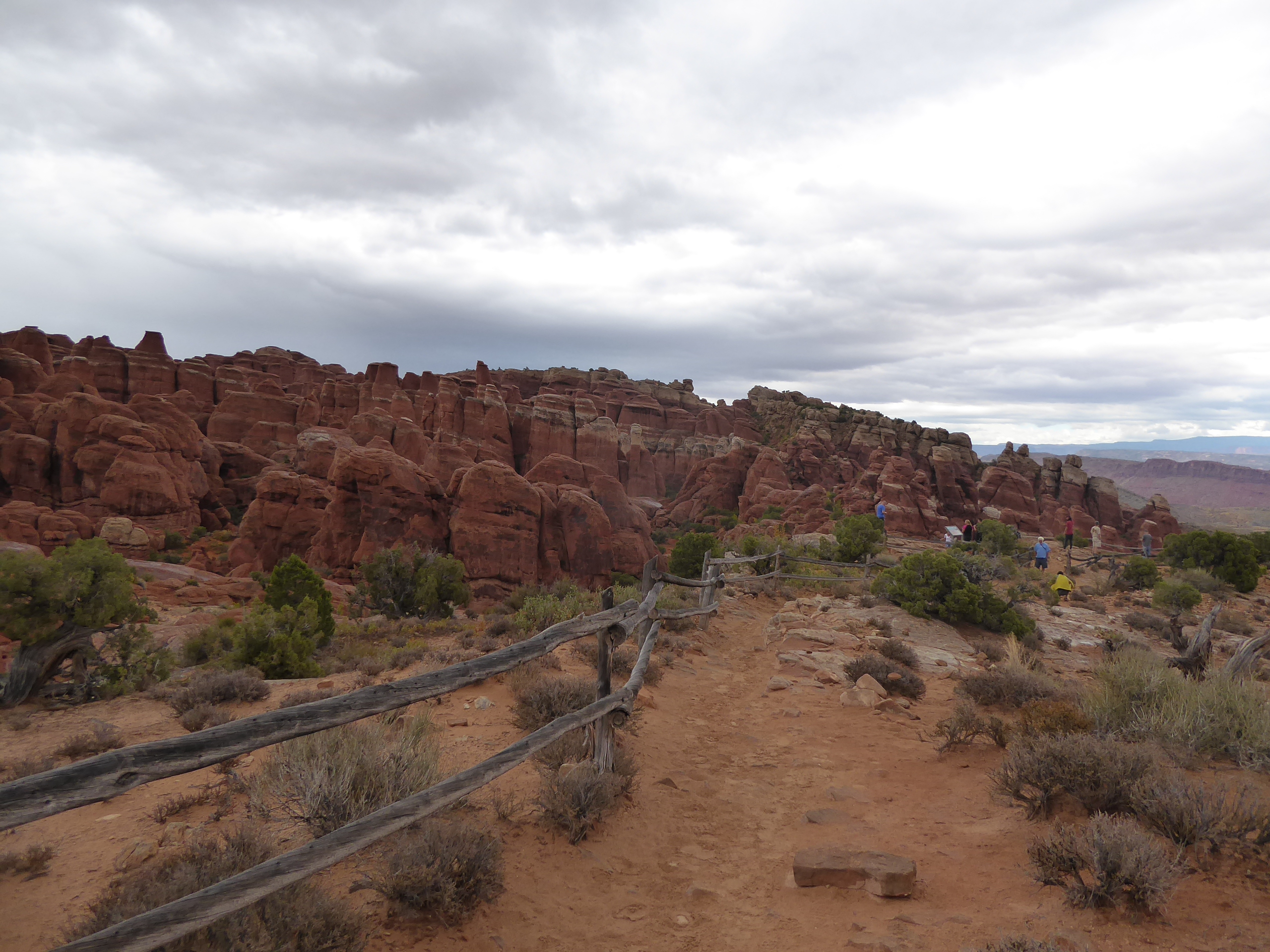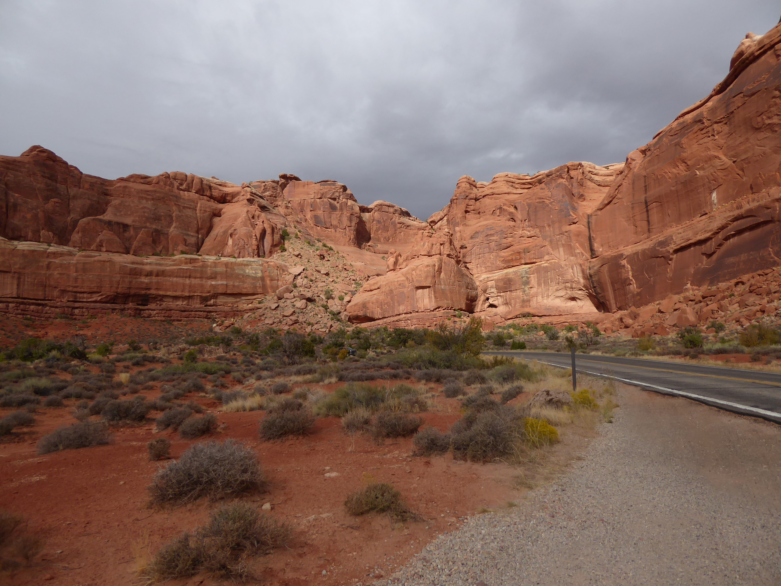Today was our introduction to Arches National Park. We got there at 9 and had to wait in line but it wasn’t long before we were inside the Visitor Center, checking things out and making a plan for the day. It was a bit of a rainy day so we decided that our best plan would be to go as far as possible, to the end of the road and work our way back. We were also interested in the “not improved” gravel road, thinking that maybe there wouldn’t be so many people there. We filled our camelbacks with water, packed our lunches, put on our hikers and set of, full of anticipation. It was one wondrous sight after another. Here is a pic of the start of the ride up.