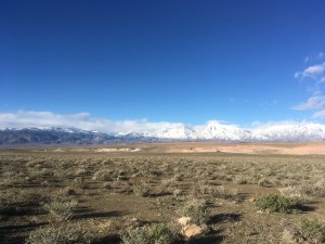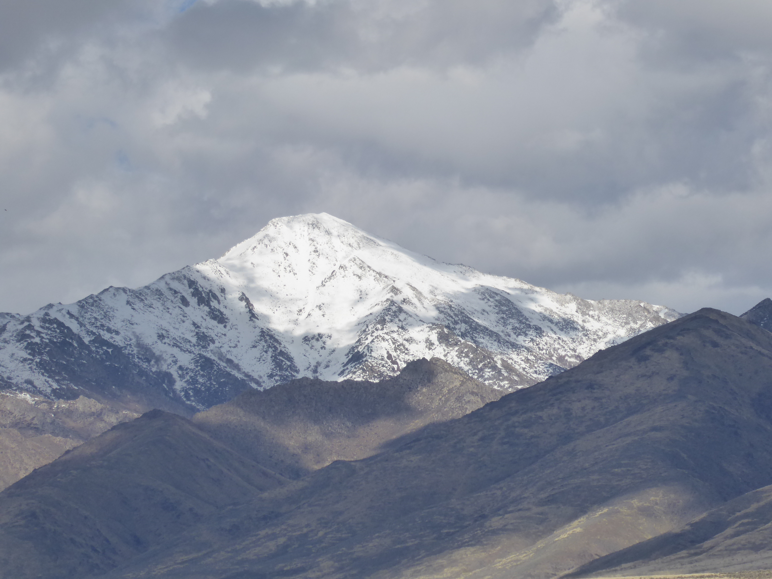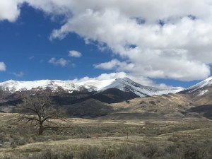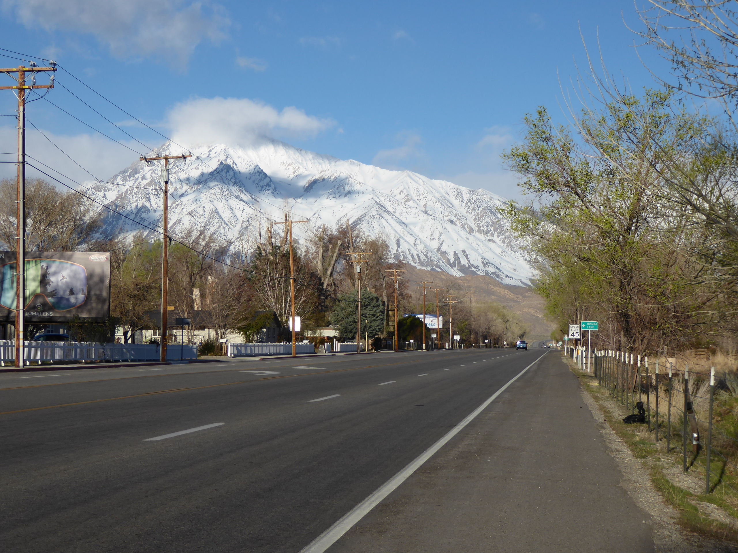 Finally! After much anticipation, we were on I 10 headed north. We stayed on I 10 until we turned off on I 215 at Redlands, next onto I 15, CA 58 at Barstow and finally, at Kramer Junction, onto US 395 to Bishop. Spectacular drive along the foot of the Sierra Nevadas, a first for us. Towering into the clouds, covered with snow, we were driving in temps of 74 degrees F.