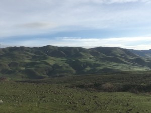 The scenery has been spectacular. At first, in Oregon, we passed through miles of yellow grass valleys. Then it changed to sagebrush and finally to grass covered mountain/hills with outcroppings of basalt – spectacular.