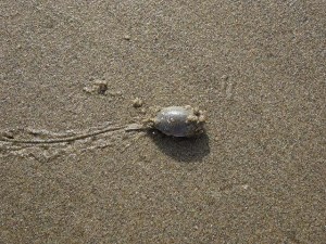 As I sat and rested with my back against a log, Mike went to take pics. When he came back he asked, “Did you see the seals? They’re surfing in the waves!” I looked and did see them playing where the waves were the tallest – where they were cut by the jetty. What a sight! Found some whole sand dollars; all the way there we’d seen lots of broken ones but in this one spot we found some whole ones. We also found several dead “sea creatures” and one live one. Never did discover exactly what it was.