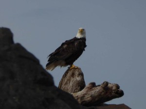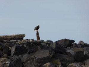 Walking southerly towards the town of Tillamook, the beach ended at a driftwood jetty on top of which sat….our immense bald eagle.