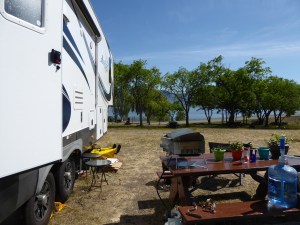 We stayed in two different sites. The first site was in an open meadow with lots of trees, chosen because we were able to set up a group camp area with our friends. In addition, it was a bit more sheltered from the winds and fewer people chose to camp there, choosing instead the lakefront and water/electrical sites (of which there were only 8). We ‘dry-camped’ there for 12 days which gave us a good feeling about the capacities of our grey/black tanks as well as the amount of time our batteries would last.