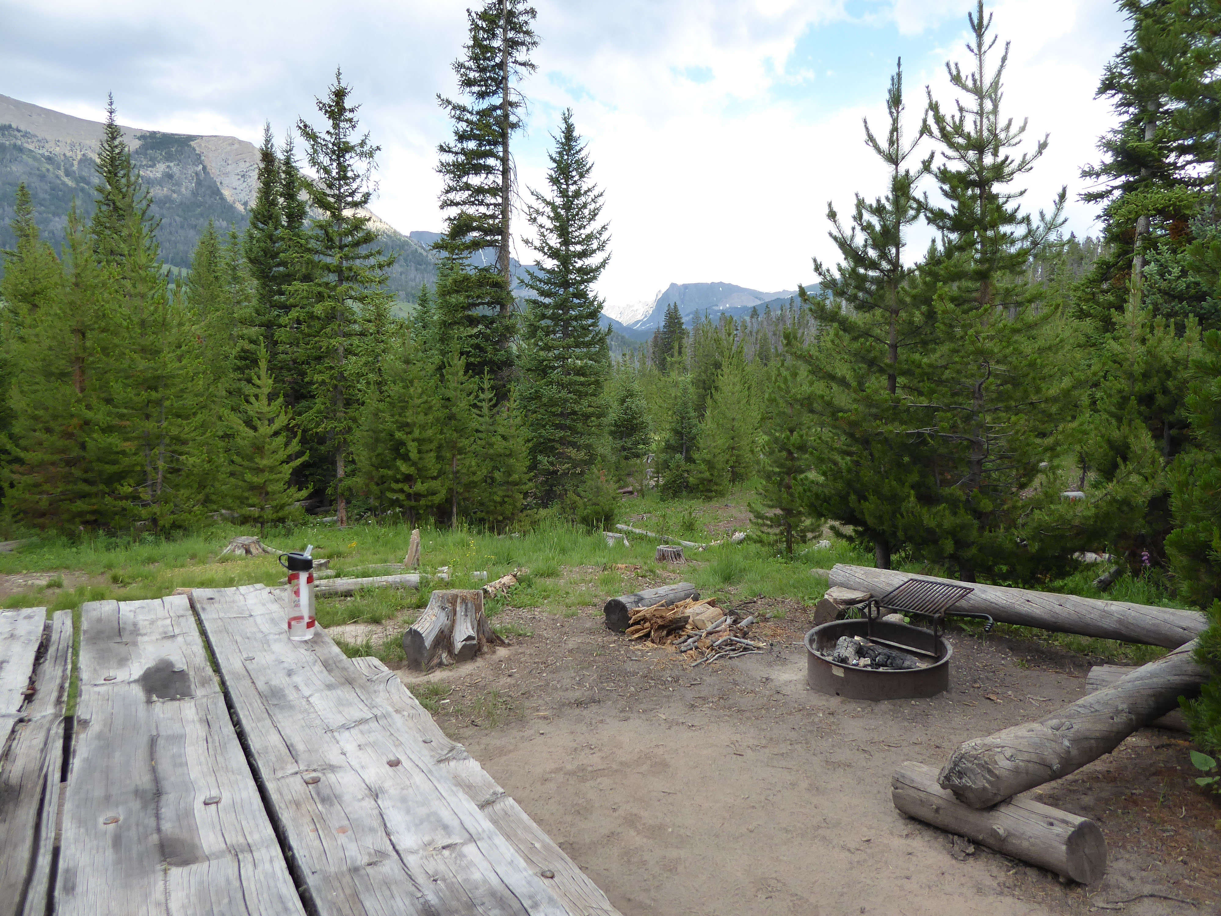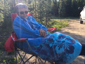 8 o’clock rolled around and we had no choice but to crawl into the tent to escape the tormenting mozzies. We read for a while and then fell into an uncomfortable sleep (not used to sleeping in sleeping bags on pads) waking up often to roll over and commiserate with one another between bouts of scratching ( I know … you’re not supposed to scratch) mozzie bites. Once we woke up to the howling of wolves….that was really something to hear! There we were, in the middle of the night, discussing how cool (or not) it was to hear these wolves and about the fact that there never used to be wolves in this area – that their population had exploded right out of Yellowstone.