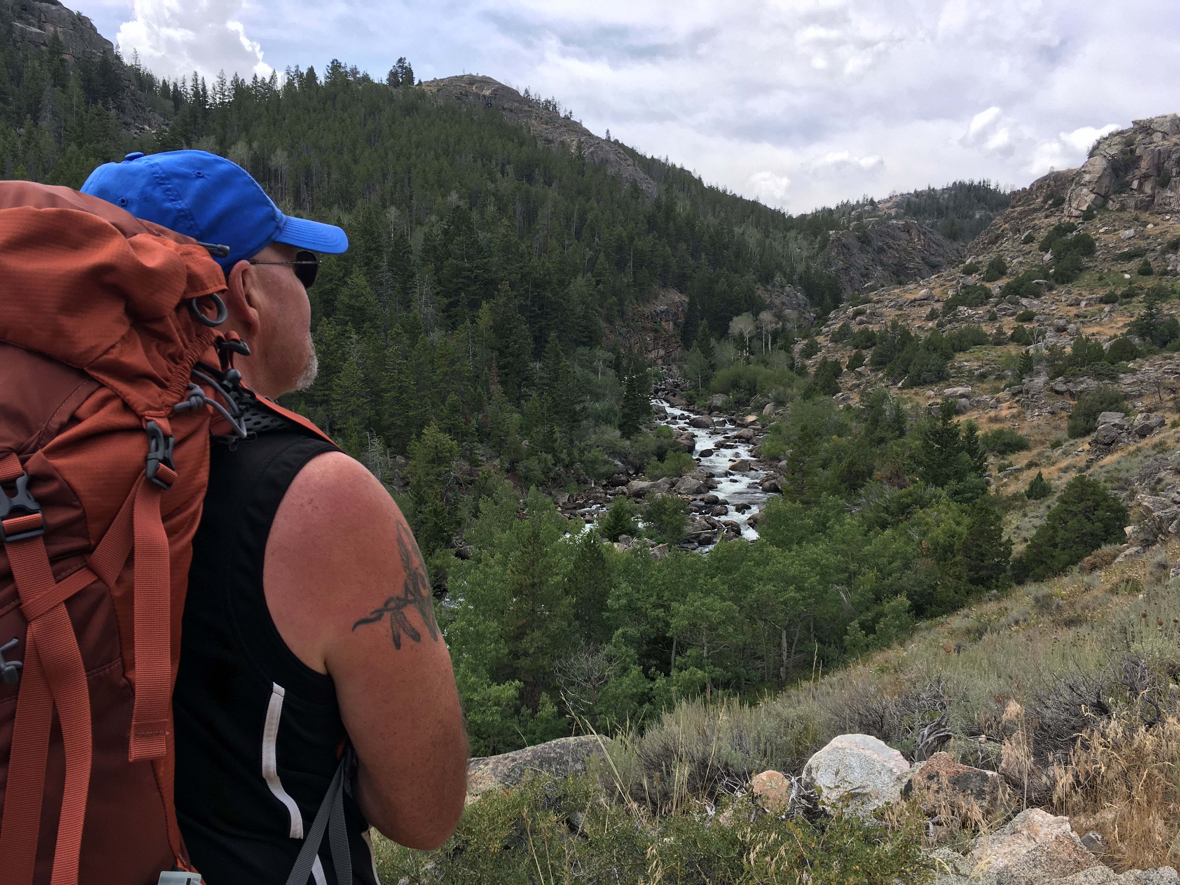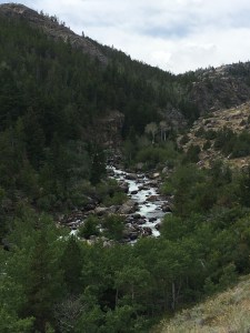 Taking a rest break looking out over the Popo Agie River (pronounced Poposhia).