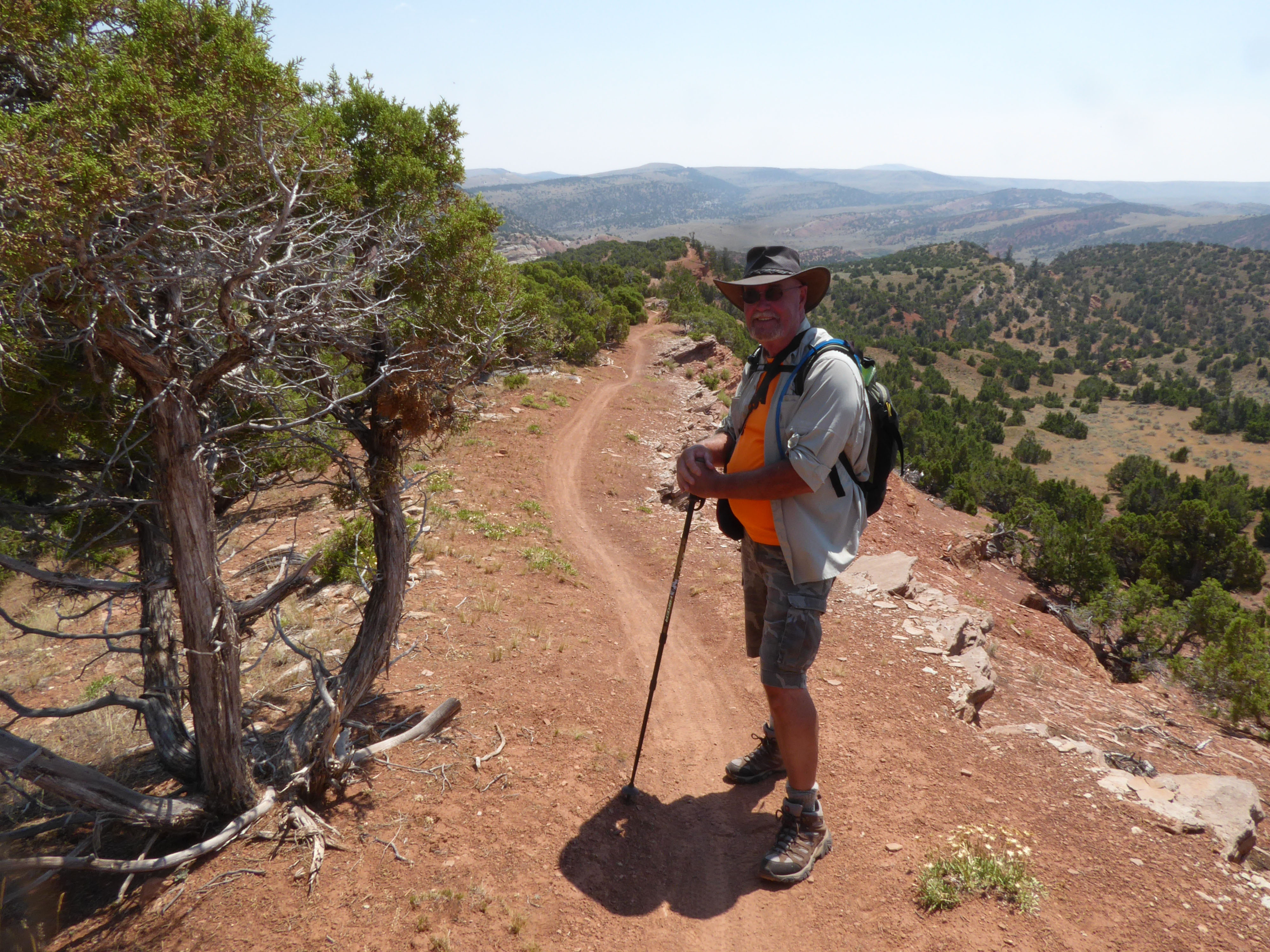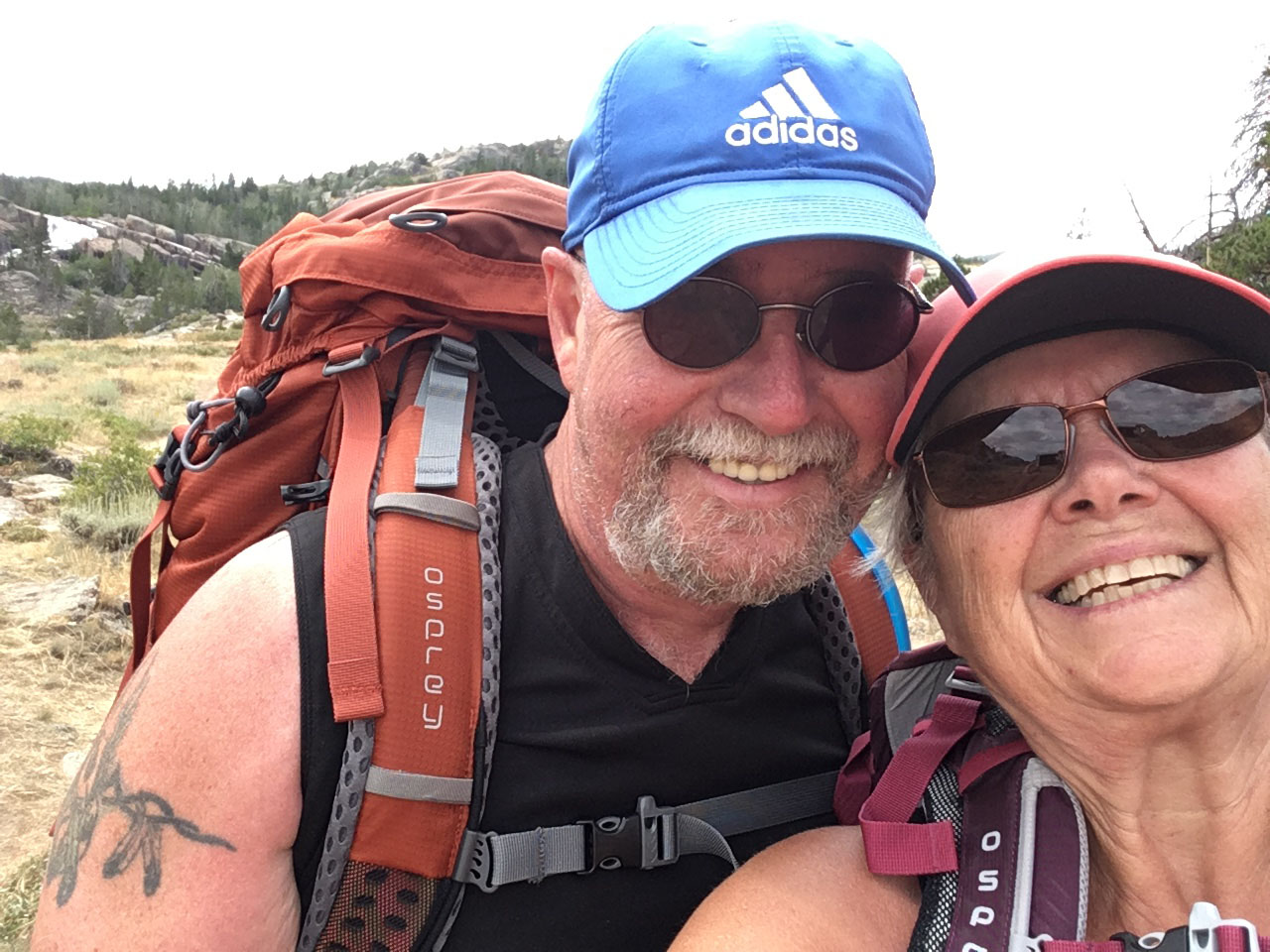 At the top. You can see the falls top left of the pic but doesn’t do them justice. This was our first hike with loaded backpacks.Today, we hiked 11 km at “Johnny Behind the Rock” with fully loaded packs. I carried 21 lbs and Mike carried 25 lbs. Lots of ups and downs and we hiked without stopping. Took us three hours. We are pretty pleased with ourselves and oh-so-happy we started training when we did. Soon we’ll be in Laramie, hiking in the Snowy Range which is at even higher elevations.