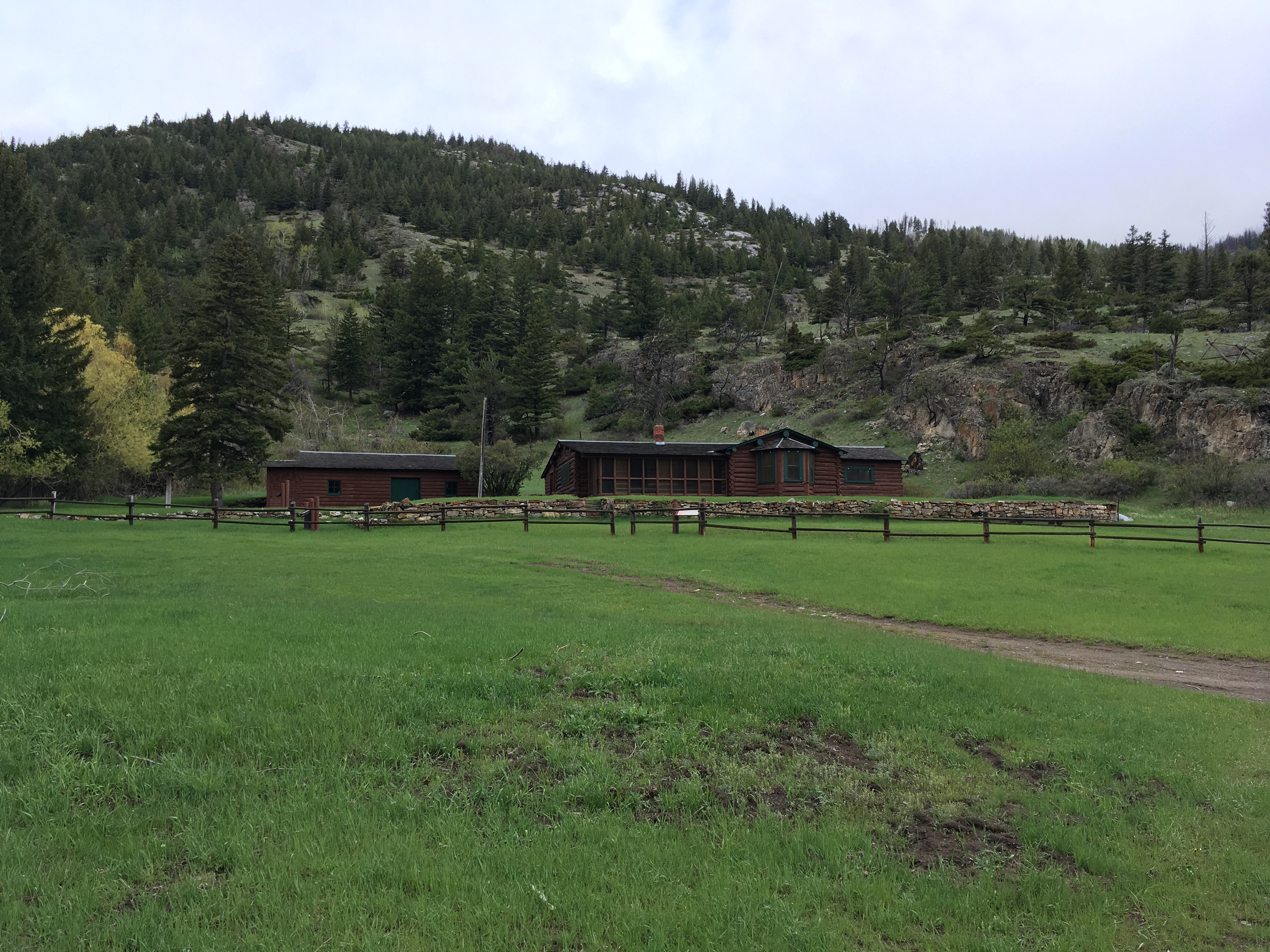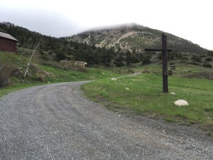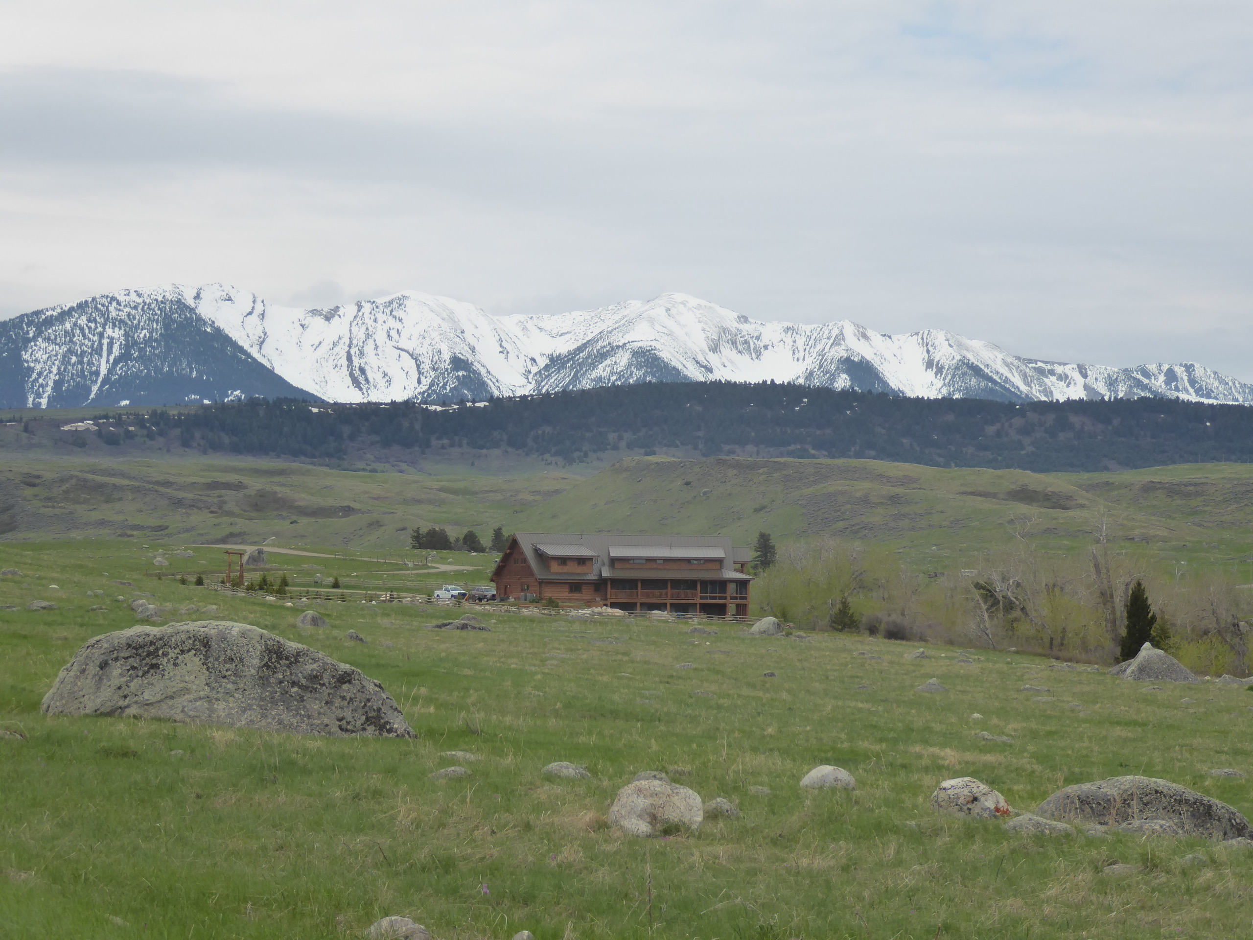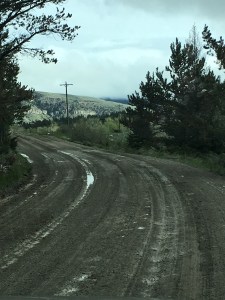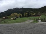 We arrived early afternoon, from Cody WY, in the pouring rain. Our first views were magnificent despite the clouds hanging low over unseen mountains. The road was paved most of the way from Big Timber except for the last 2 miles when the pavement changed to mud and gravel. In dry weather, no problem. In the pouring rain, pulling a fifth wheel trailer, not so much fun but with 4 wheel drive engaged, really no problem at all. We were just covered with mud!! That is….the truck, trailer, running boards and our feet.