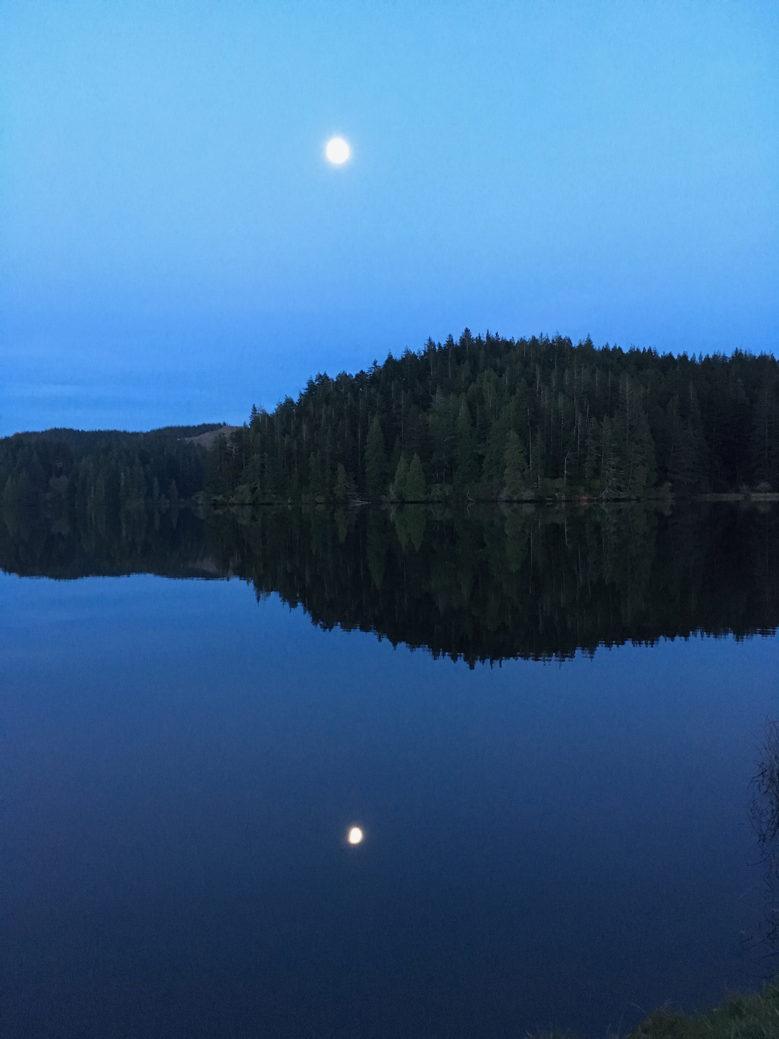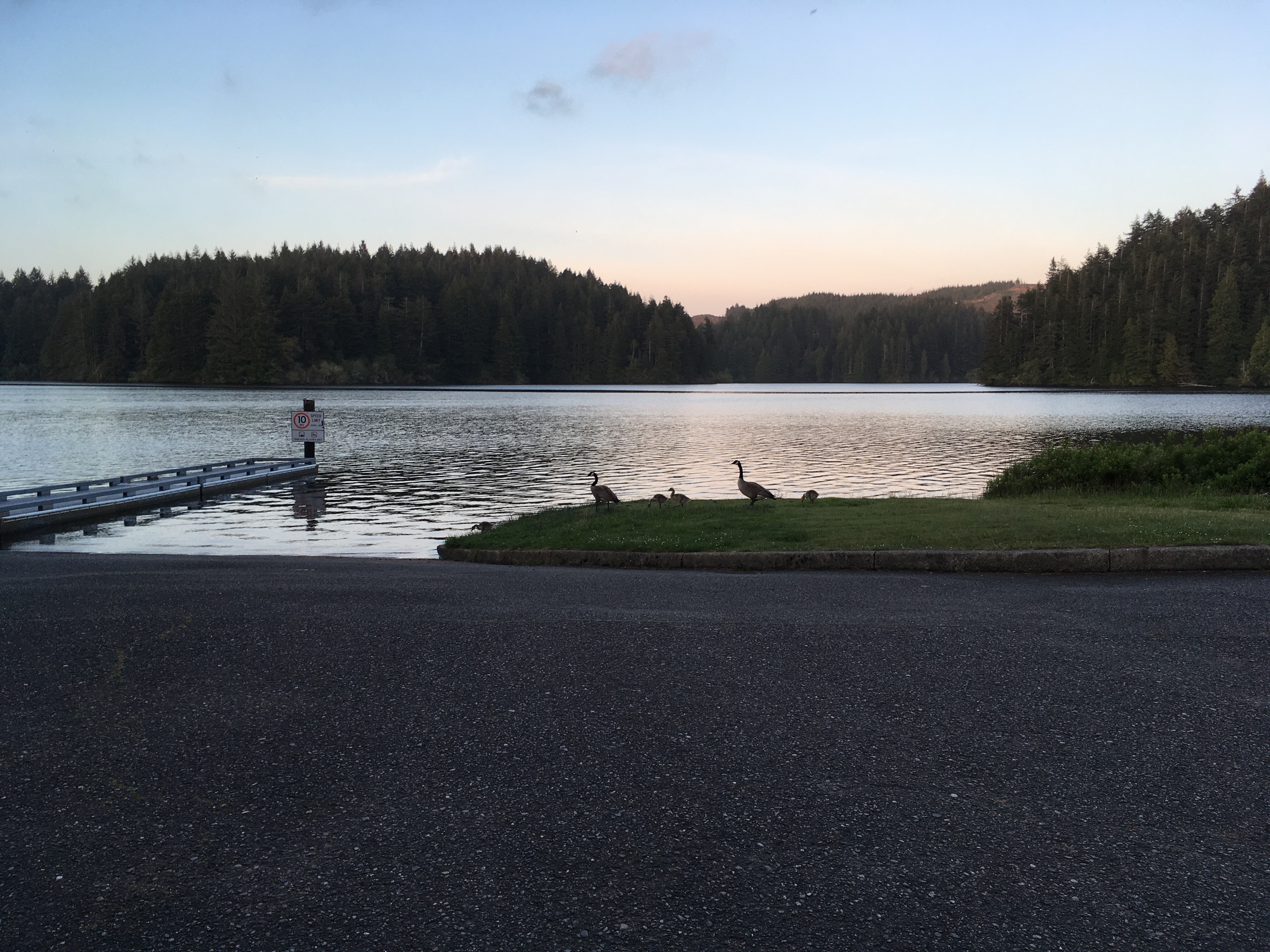 What a beautiful place to spend two months. W. Tugman Campground is in the southern part of the state between Reedsport on the north and Coos Bay on the south. The campground lies on the shores of beautiful Eel Lake. Even the three weeks of constant rain in April was made worthwhile by the views and reflections of Eel Lake in the misty rain, the calls of the Canada geese looking for and finding the perfect place to raise their young, salamanders swimming near the surface of the lake and finally, the sun, breaking through the clouds, highlighting the lakes details. Morning, noon, night; rain or shine, we appreciated being on the shores of Eel Lake.