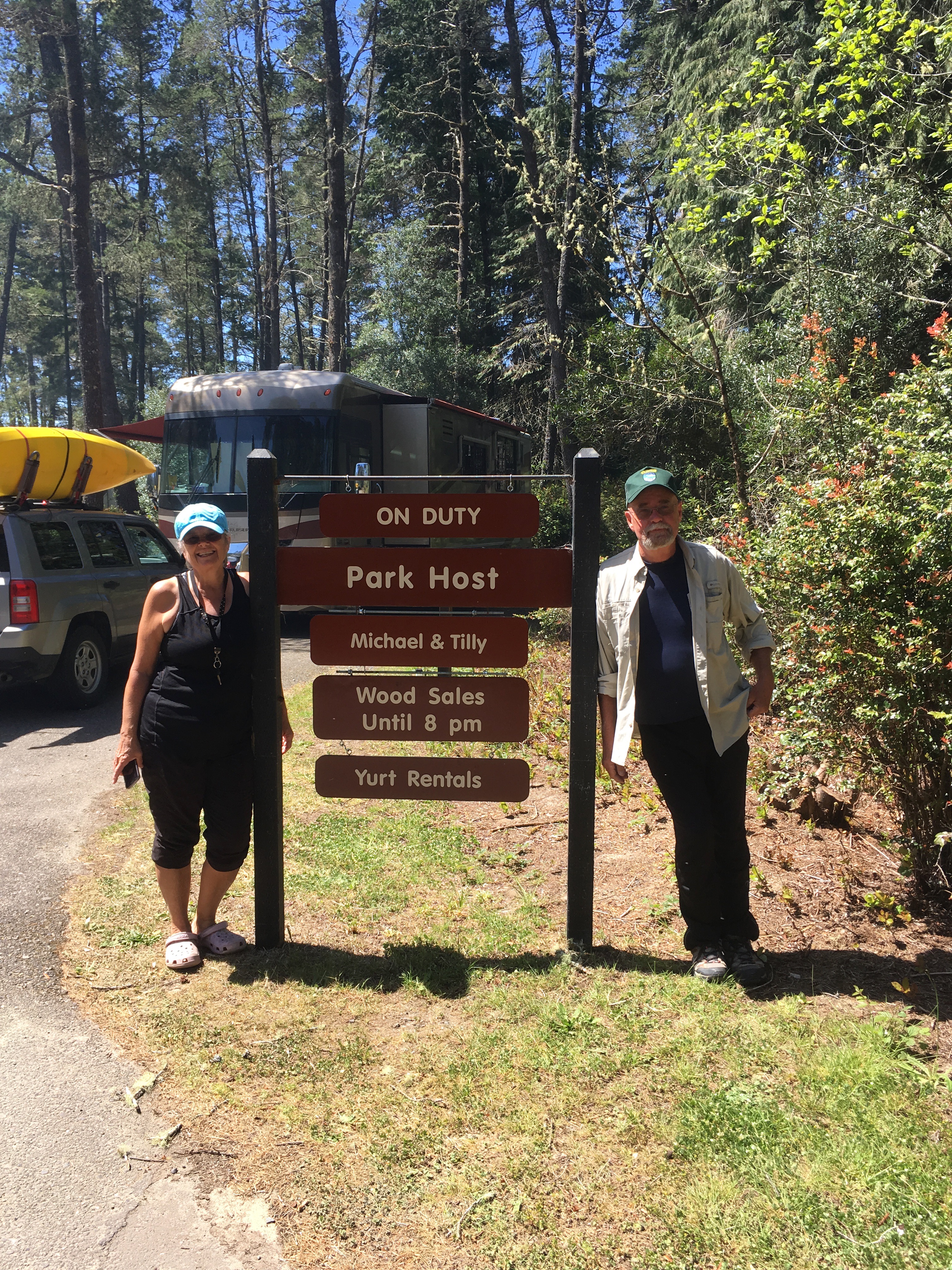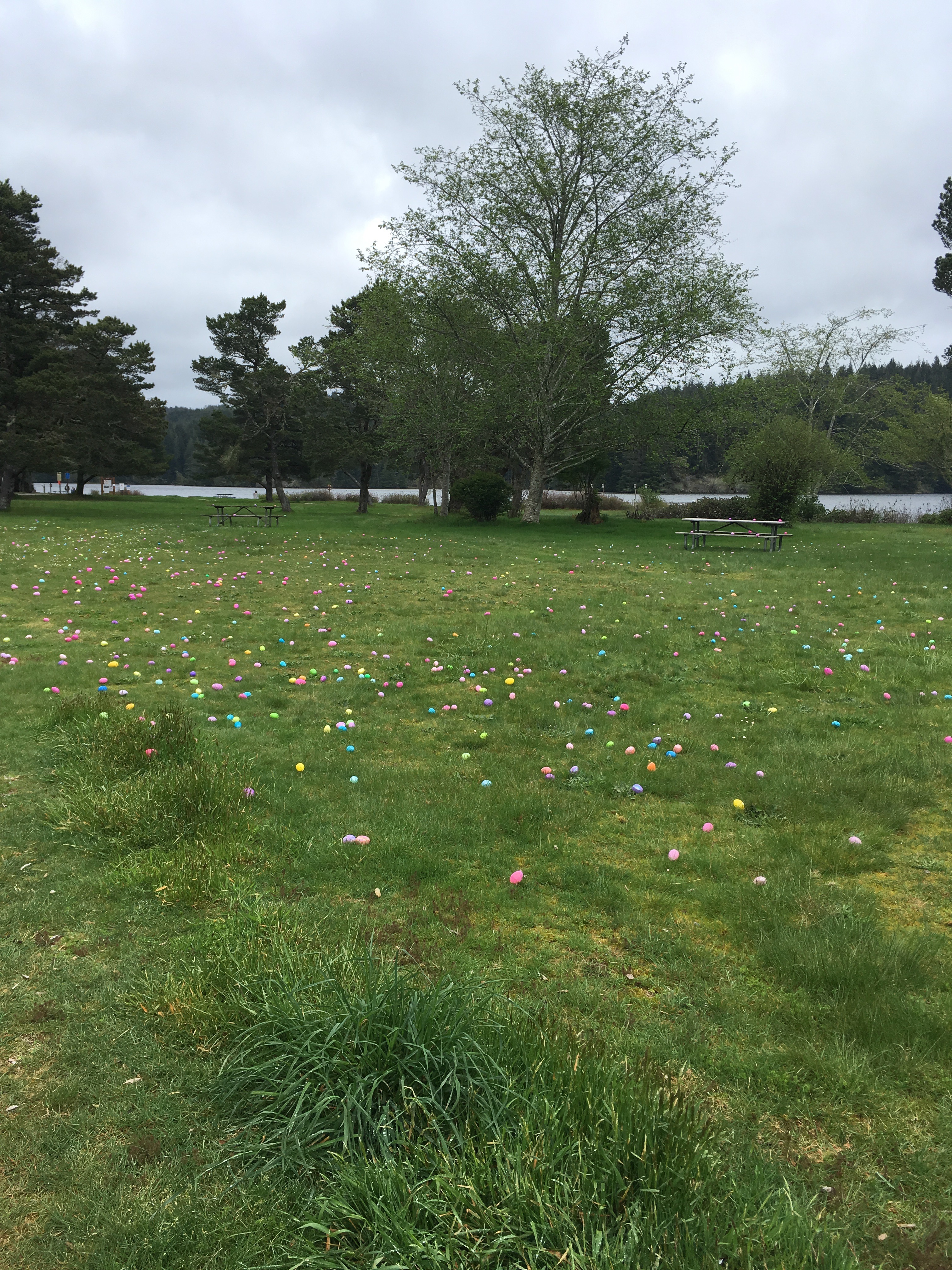 Our “hosting” duties required that we be present and available to help campers with a variety of requests, including selling firewood, yurts, bike helmets and making sure the kids wore them (required by law are in Oregon), eradicating bees nests from electrical posts, dealing with overly loud campers after 10pm at night, cleaning up after the fire department had to put out a fire in the day use area resulting from partiers dumping the rest of their hot coals and trash in the garbage can after they finished BBQ-ing, sweeping up bat guano from the floor, counters, and sink in the gazebo, litter-picking, cleaning fire pits and locking up the trash compacter (only after making sure no-one was inside it collecting cans or other such treasures….yes, it did happen). There was even an Easter Egg hunt including an Easter Bunny who arrived on the front of the local fire engine. Never a dull moment in the life of a camp host!