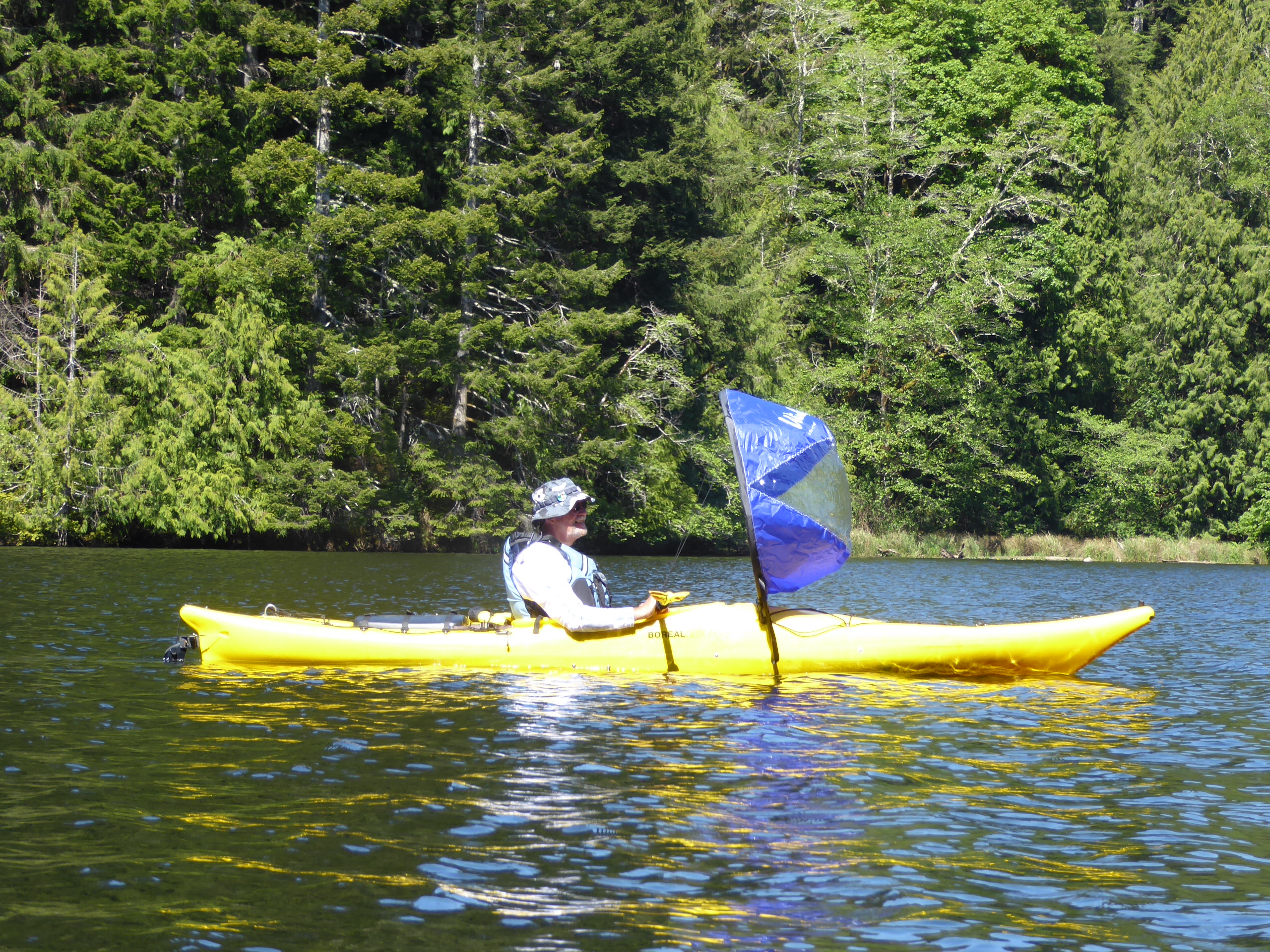 With the coming of the sun we “fair weather kayakers” turned once again to the pursuit of kayaking. We had to time it just right since the sun usually didn’t break through the clouds until around 10 am and around noon, the wind would start to blow, creating white caps out on the lake. (Although….the wind did start Mikal to wondering what it would be like to “sail” in the kayaks and to order us each a sail.)