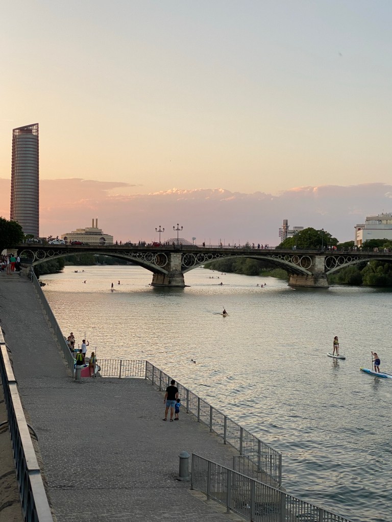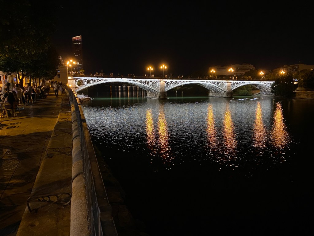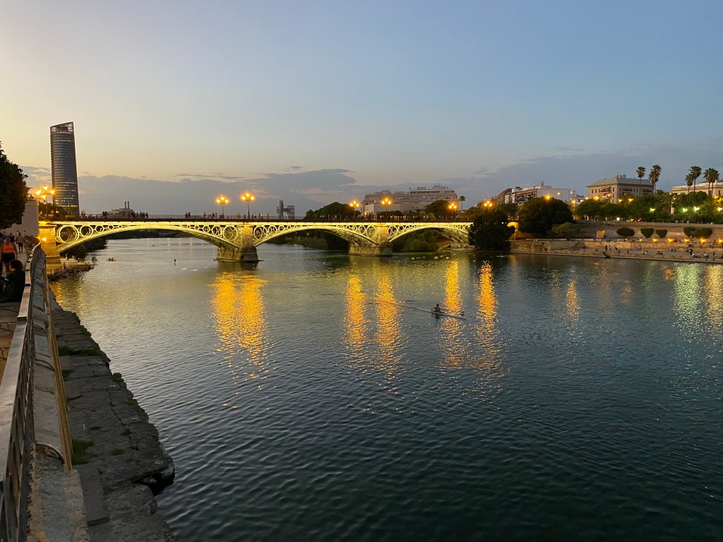 Found our hotel, checked in, showered, and promptly fell asleep for 4 hours!!! We both woke up with a strong need to explore, find the cathedral which is the starting point of the VDLP, find a place for dinner, and explore Trianna where there is a backpackers hostel. We did all those things. Walked over the Trianna bridge, watched the sun set over the Oro tower, sat in a taverna and had dinner, watched the rowers and kayakers on the river and saw the bridge lights come on.