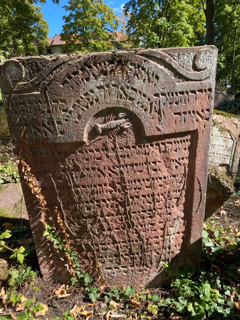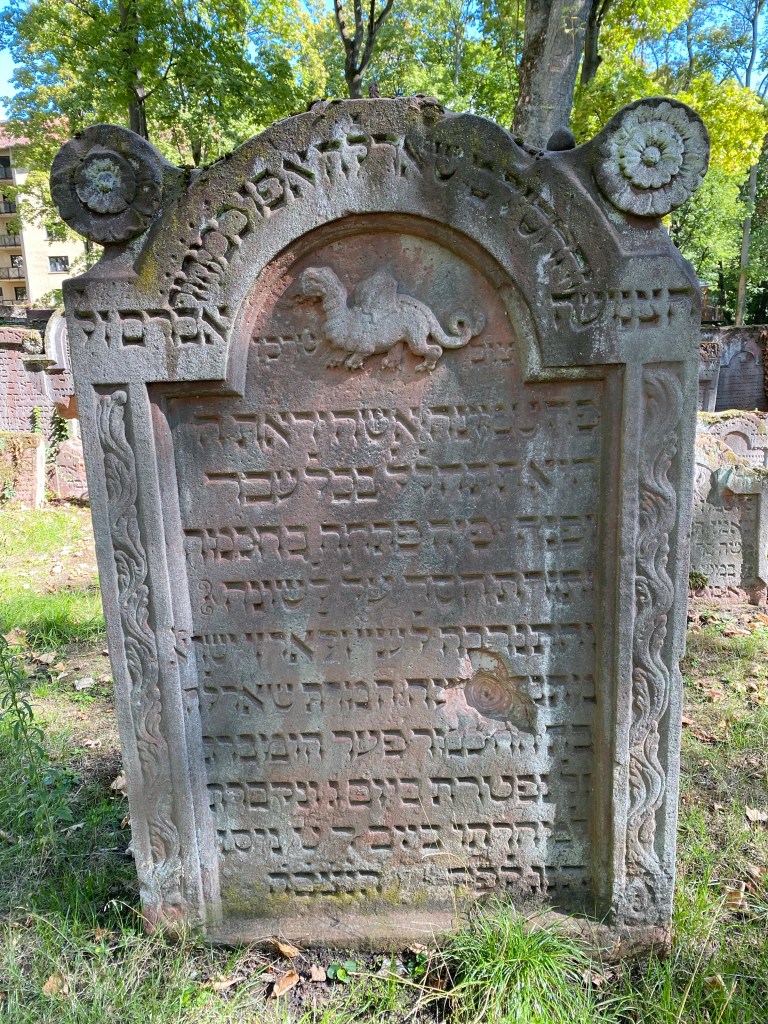 “Many of the gravestones in the cemetery bear images such as a rabbit, a windmill, or a fish trap. The houses in the Judengasse didn’t have house numbers. The marks on the gravestones show in which house on the Judengasse the deceased lived.”