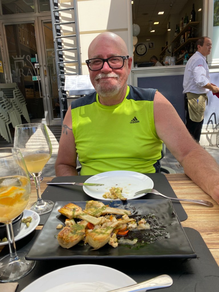 The flight to Sevilla was uneventful…on time…AND…our packs arrived. Squeezed onto the airport bus which happened to be free on this day-I still don’t know why. The hotel had sent instructions about where to get off the bus and by good fortune, we chose the right stop. Started walking but became distracted by our thirst and by all the sidewalk cafes. Stopped for a sangria and a beer, some grilled artichokes and a couple of small tacos and our energy levels were restored.