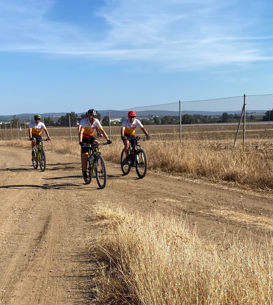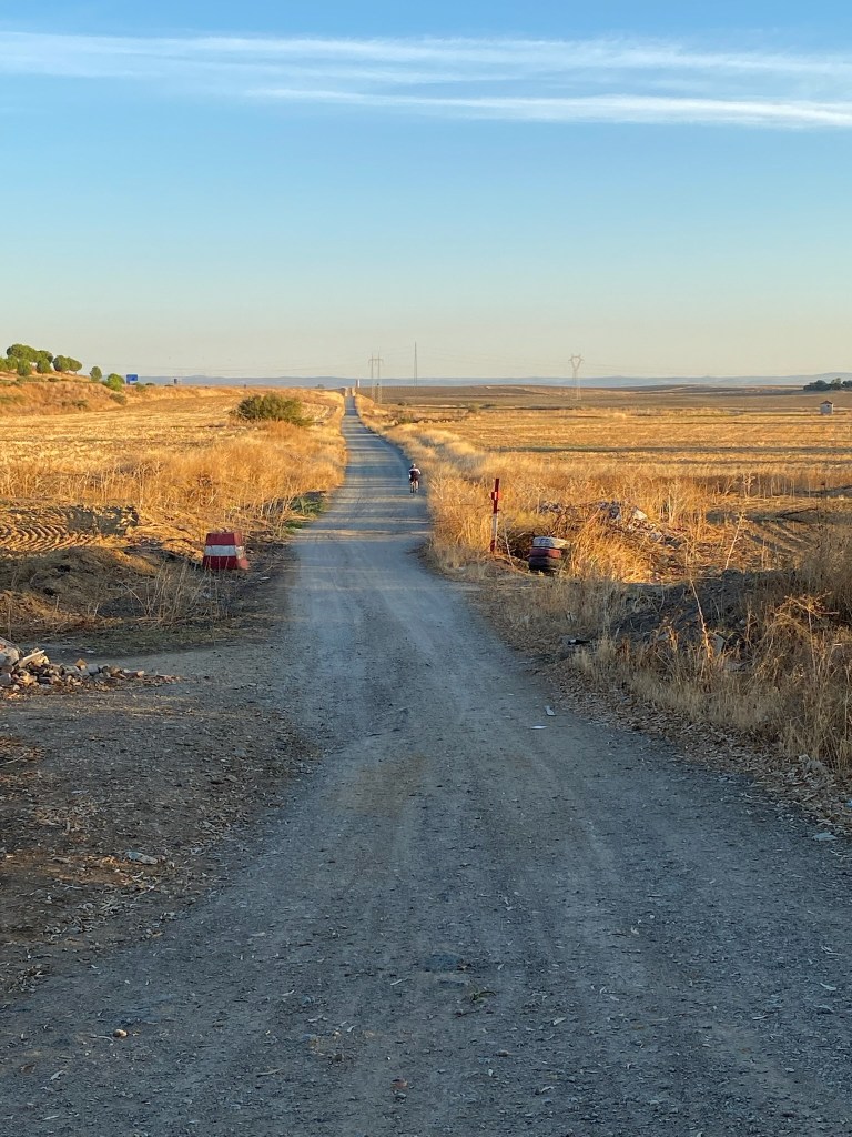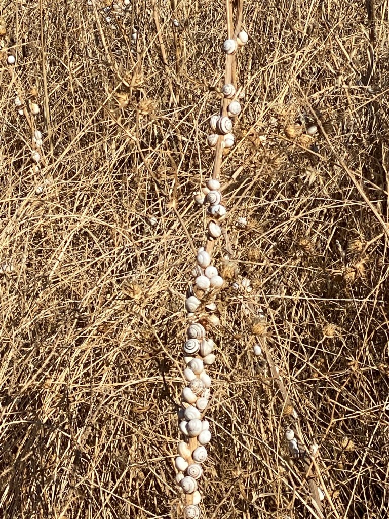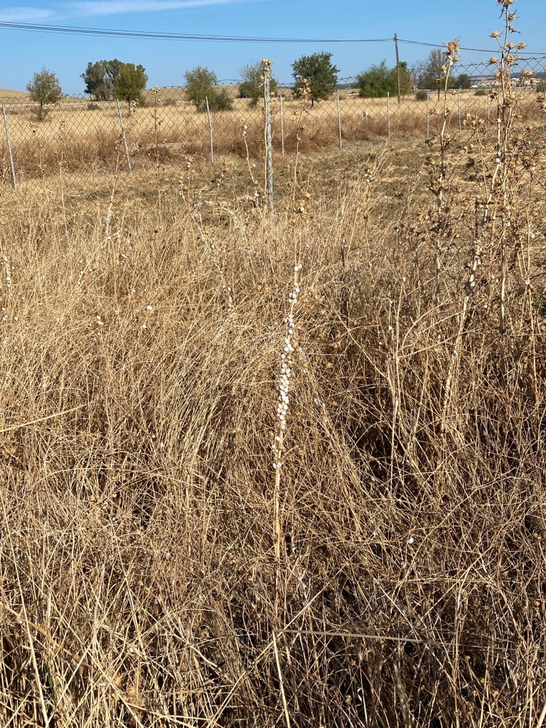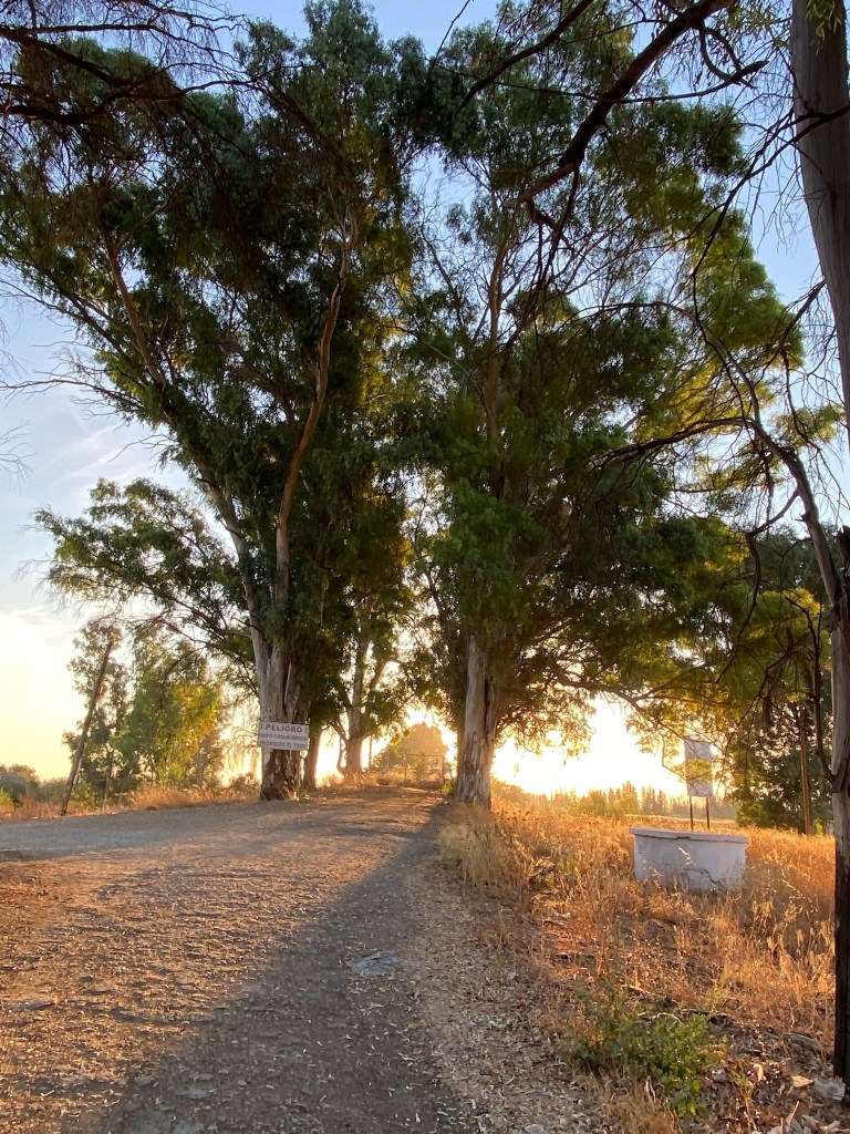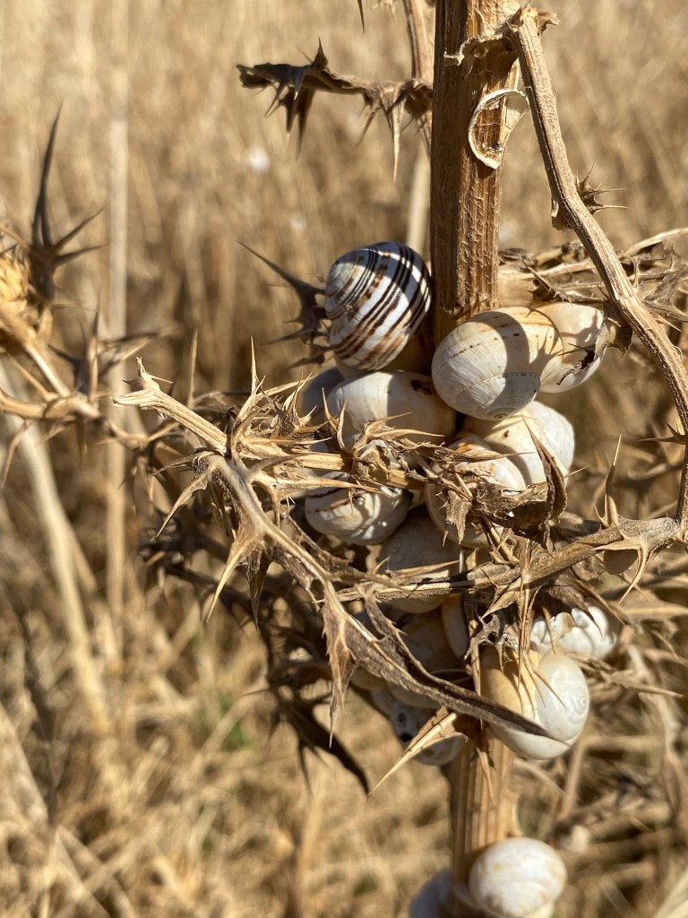 It was a comfortable walk today. Things that drew my attention: all morning, people on bicycles passed us, singly, in pairs, in groups of 3, 4 and more. Didn’t see as many coming the opposite way, towards us as we did going the same direction as us, towards Guillena; cotton fields, lots of them with cotton pods just bursting out of their pods and lots of cotton clumps on the road; masses of small, white snails firmly fastened to the stems of dried out grasses; beautiful landscapes.