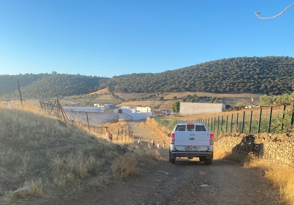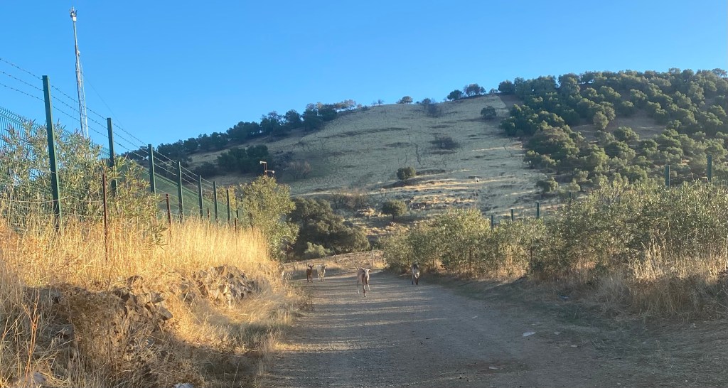 We took our time. Just past the sign, we were surrounded by a herd of goats led by a huge dog. I said, “Hola Perro! Hola Perro!” in the sweetest, kindest, most loving voice I could summon up. Well! That great big dog just left his loyal flock and came over for a cuddle and stayed….and then a second one came over for a cuddle too….thank heavens the flock knew where to go lol. They were followed by their human herder in a car.