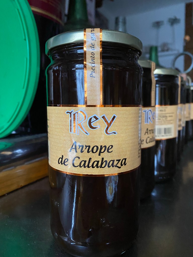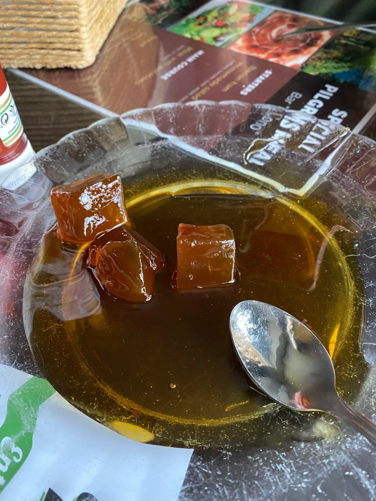 We went out for dinner and a drink to a local bar, Bar Cono. We were watching the waiter serve an unusual looking dish. He’d grabbed a jar from the shelf beside me so I was able to have a look to see what it was….”Arrope de Calabaza” which translated into “Pumpkin rubber.” LOL LOL. He saw our interest and brought us a sample. Jellied pumpkin in honey with aniseed. Very different and very sweet. We love trying different, unusual foods and this was one.