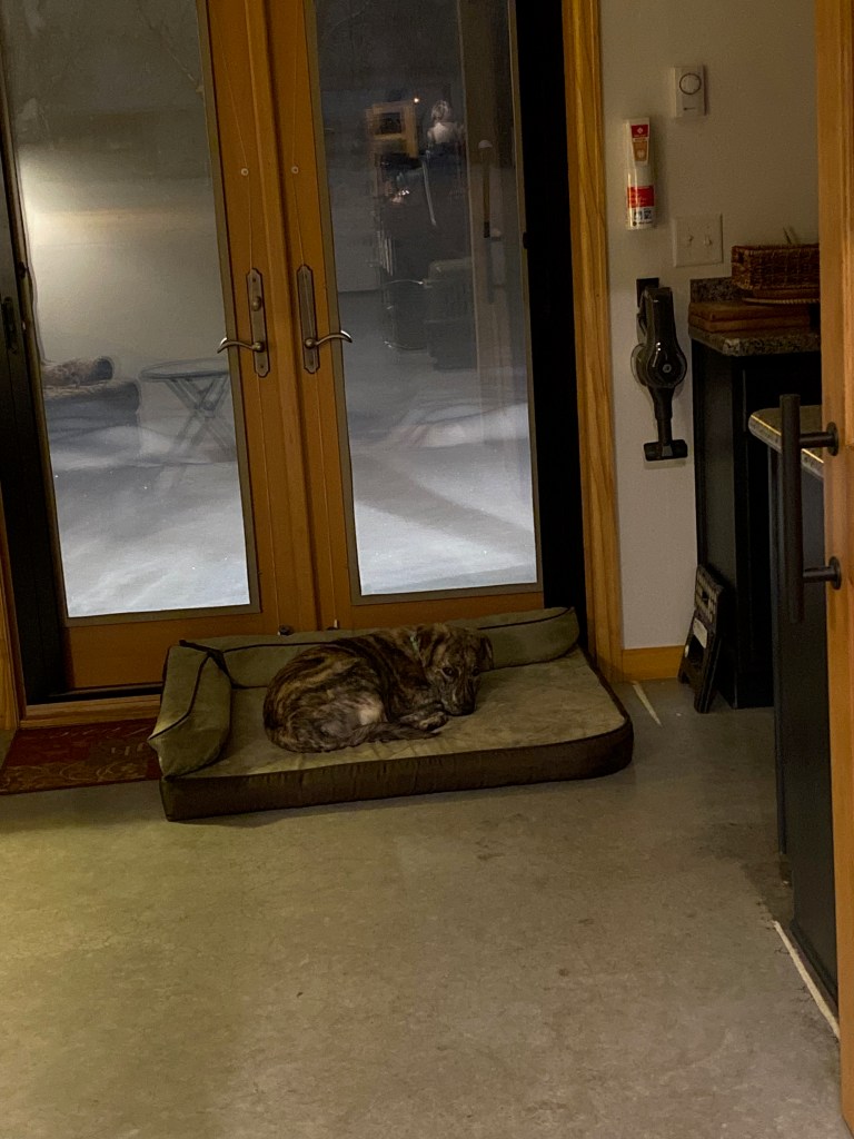 The Pet Connection sent us home with everything we might need in caring for Marley….food, collar & leash, crate, bed, brush, puzzle food bowls and more. Because we have concrete floors in our house, we felt the need to get some carpet remnants so he’d be able to have better traction during his recovery. We found some great remnants at the Lander Flooring shop on Main Street and in retrospect, watching him struggle to learn how to walk on three legs, it was so worthwhile. We also bought some extra beds…one for beside the bed so he would feel safe and another for in his crate and the one from the Pet Connection went into the car.