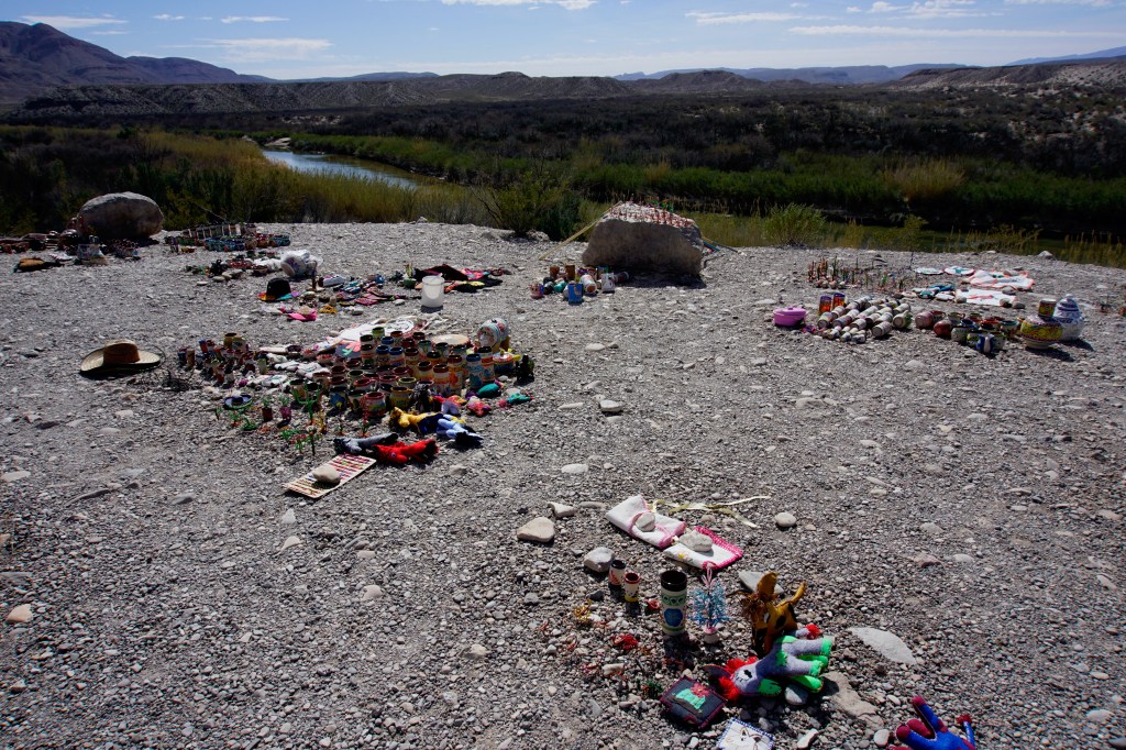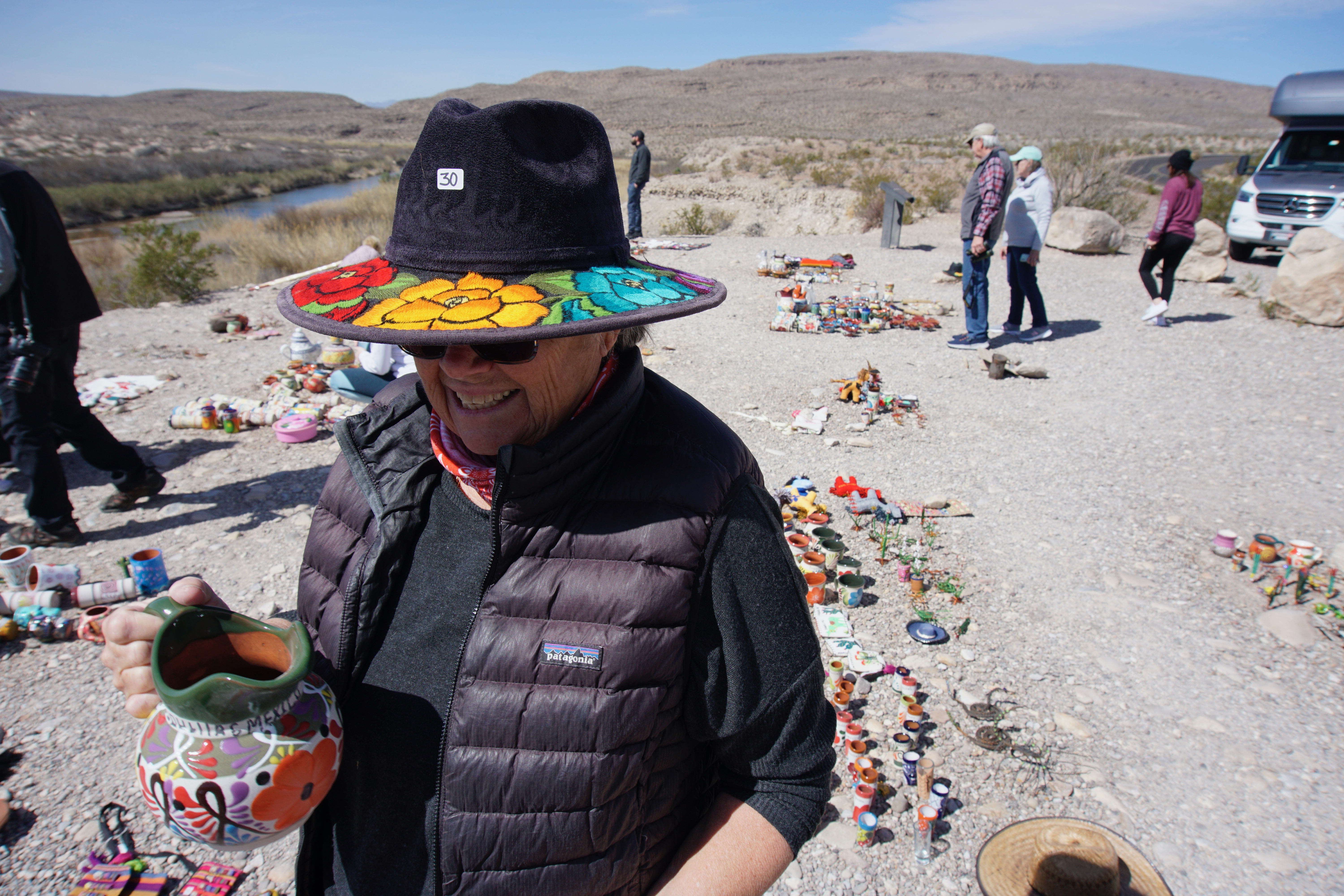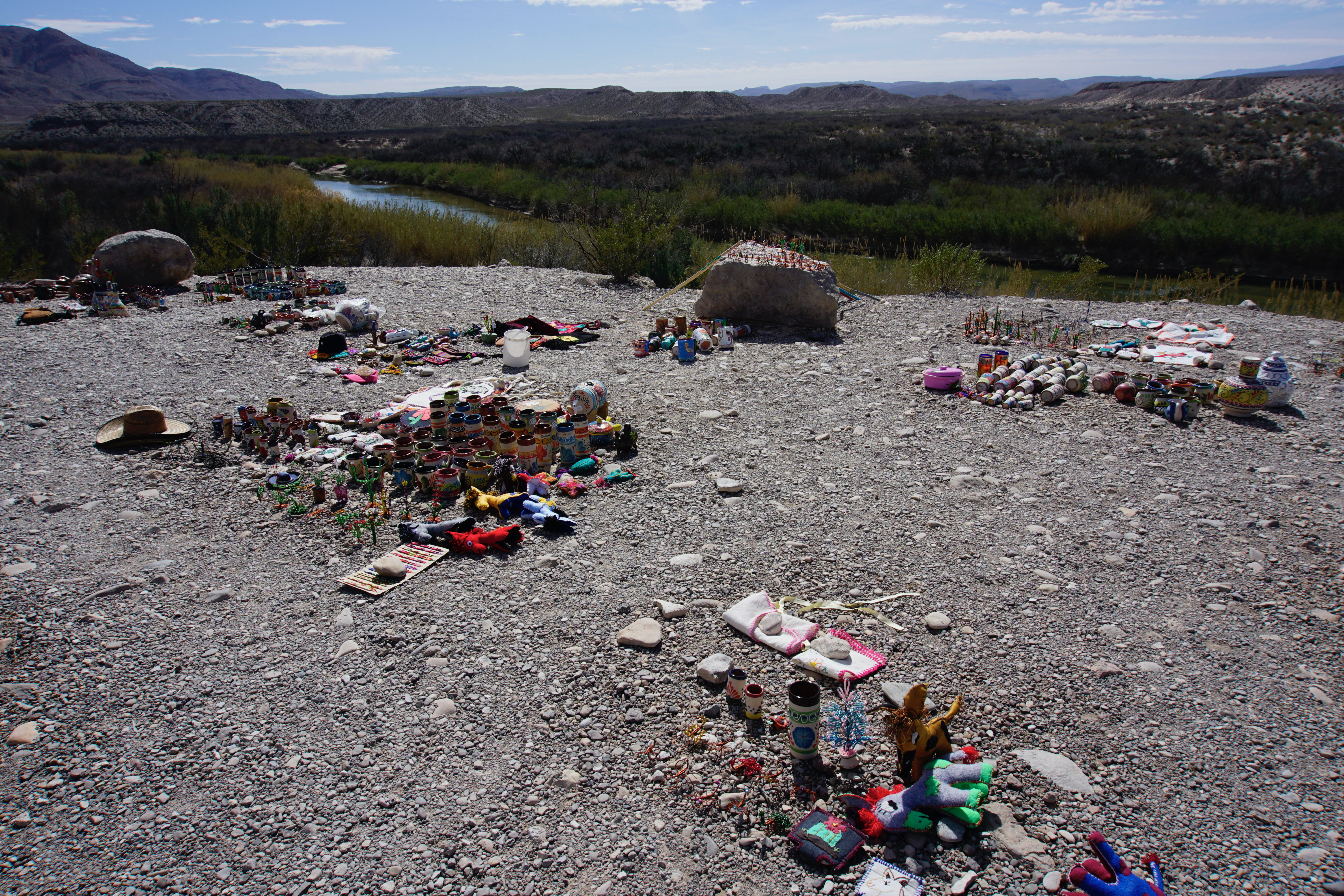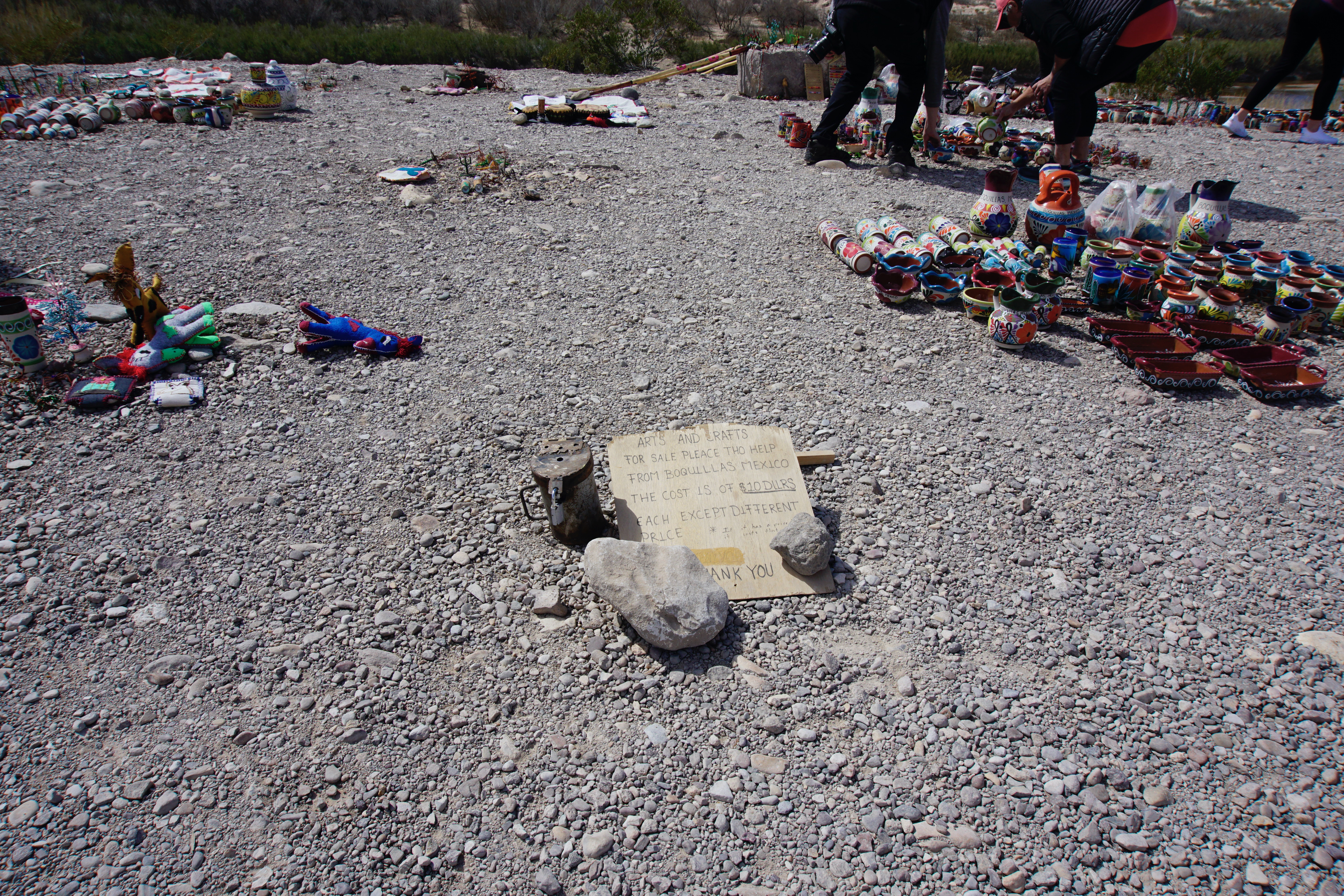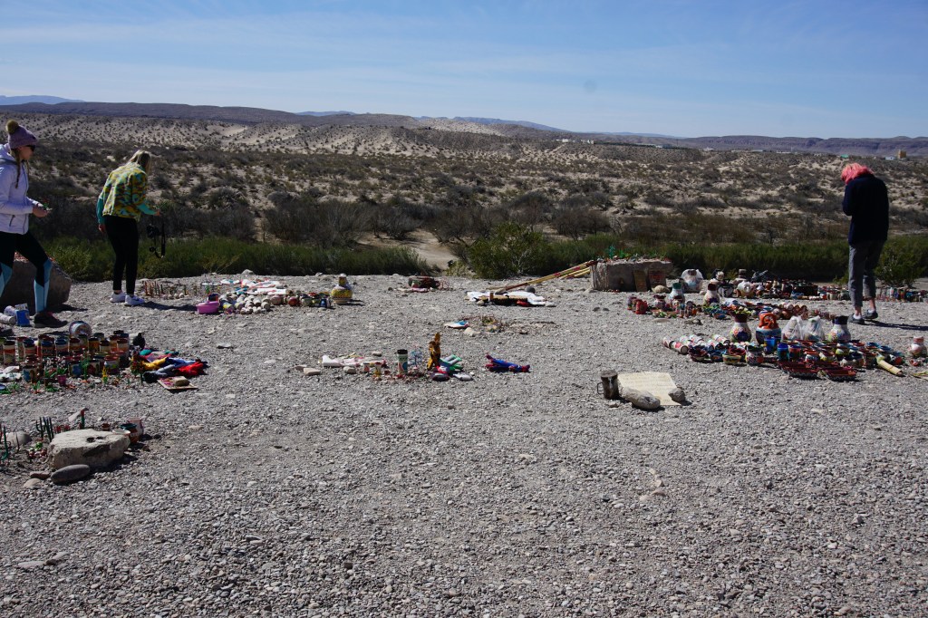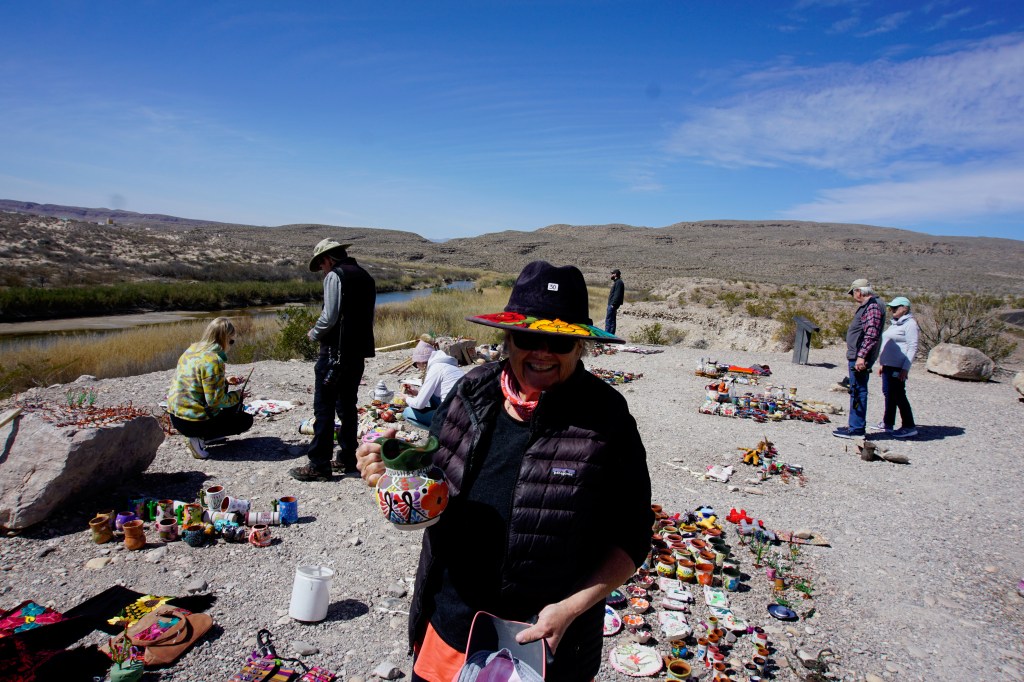 Onwards to check out Boquillas Canyon and Rio Grande Village. At the Boquillas Overlook we found a Mexican market of sorts….all kinds of crafts like pottery, hats, wire sculptures and more made by the Mexicans who live across the river. We met two sisters from Texas. Their father was a border patrol agent. They told us that it’s this market, and a few others, as well as visitors going across for food and margaritas, that have kept their town going. (We didn’t bring our passports otherwise we would have gone across into Mexico too!) Apparently during the covid years, they almost didn’t make it. They also told us we weren’t allowed to buy because we’re not paying taxes but I don’t think it’s too closely checked. There seems to be a good relationship between the two sides of the border. It was such a surprise to find it. The market was right beside the Rio Grande and on the other side, a canoe was beached. Several times a day apparently someone from the other side rows over to check out and collect the box where people put the money for the items they buy. Fascinating!!!