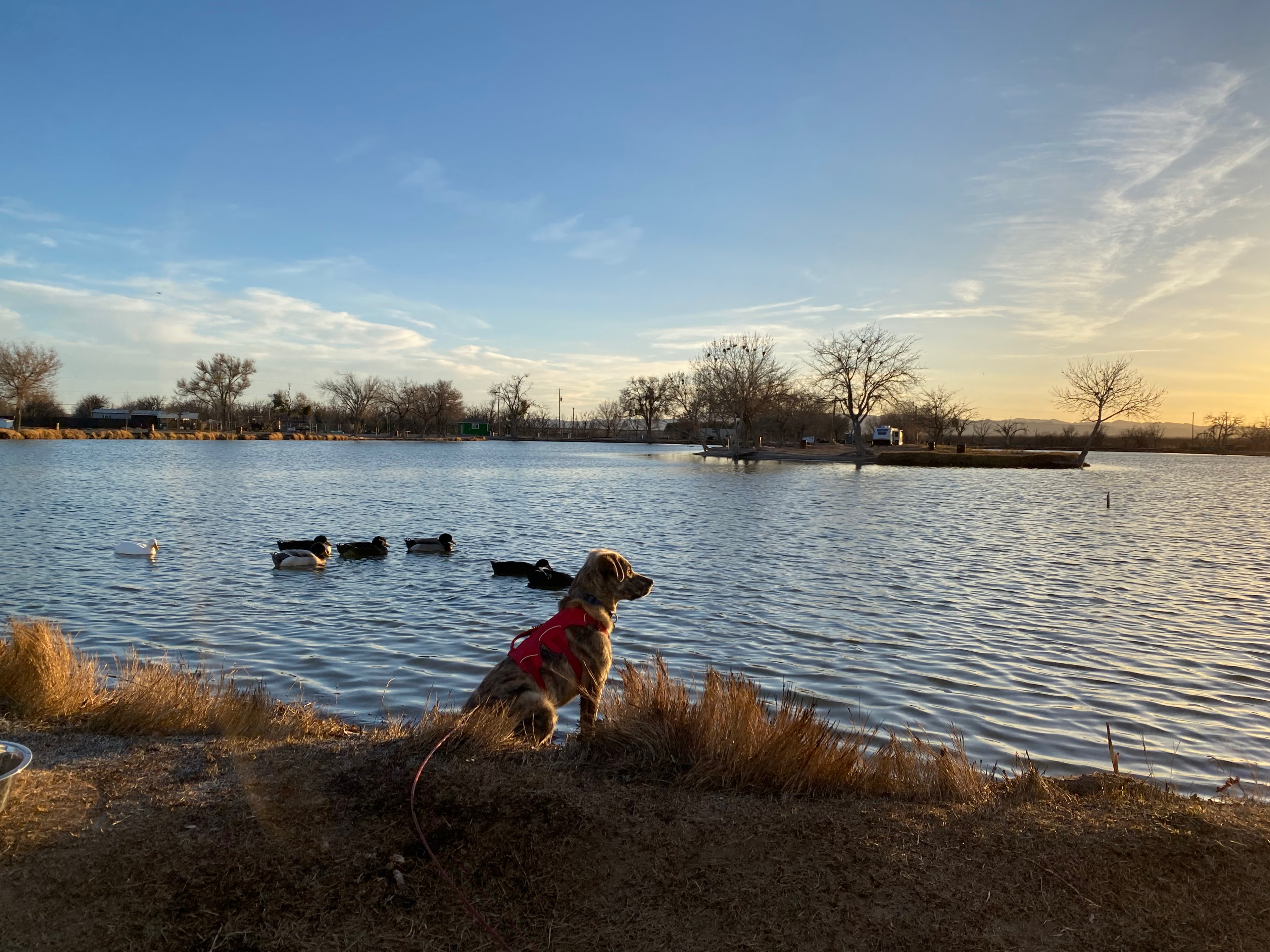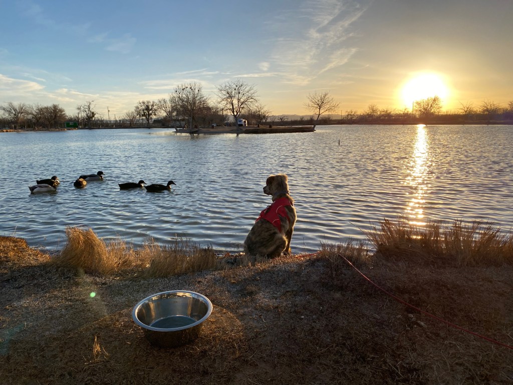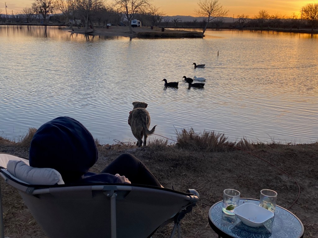 Having done all our errands, we came back home to sit in the sun with a drink and to watch the sun set over the water. Lovely but still chilly, even in the sun. Marley loved chasing the ducks. He was so cute….he’d wait silently, very still, until they came close (we’d fed them some bread crusts and they came looking for more), then he’d charge. The ducks would scatter a short distance away….little did they know Marley wouldn’t swim after them. He hardly got his feet wet. But we have learned …. he likes to dig….a lot!!!!