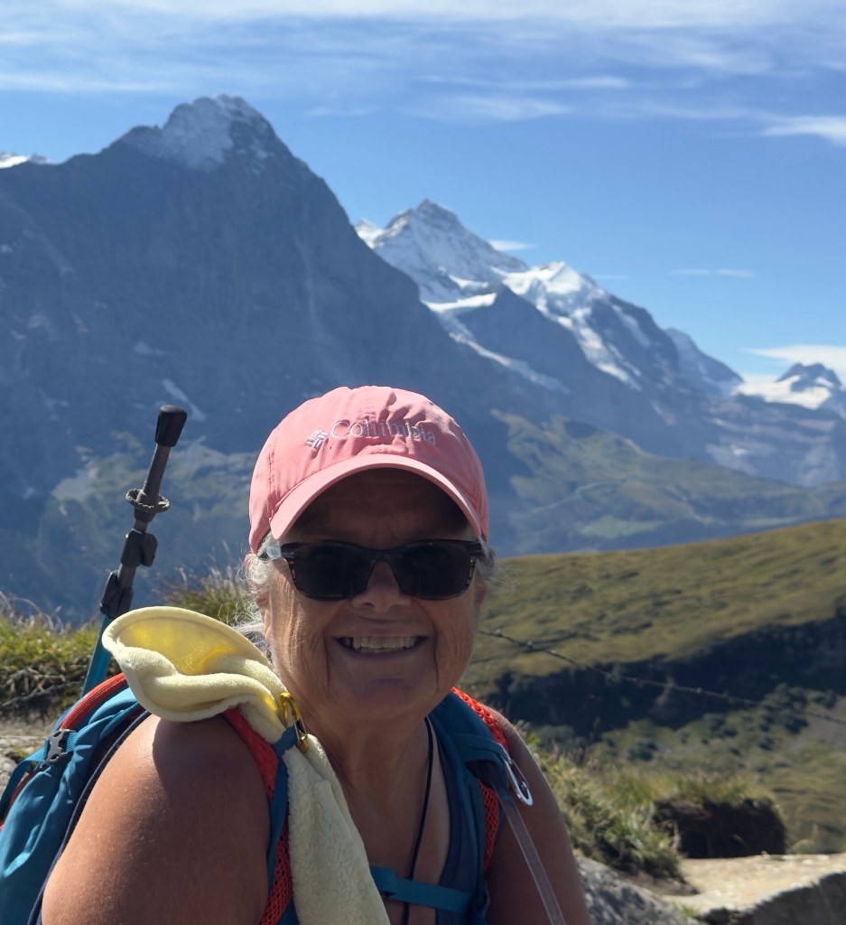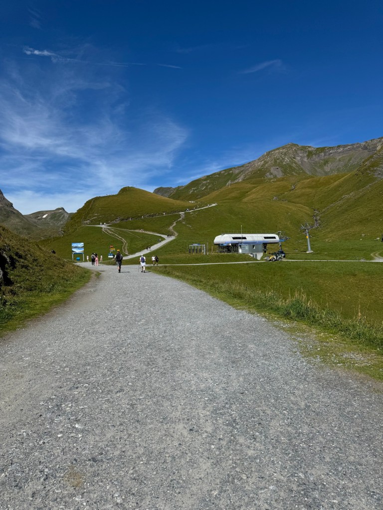 Once we reached the top, there were many different options available: a Cliff Walk along cliffs with a metal, see through grate for the floor (kind of scary but we would have done it except for the many people on it); special viewing platforms; a multitude of hikes (including the option of walking part or all the way back down from the gondola); para-sailing and more. We chose to hike to the Bachalpsee, a 6km return trip. It was a beautiful sunny day, lots of people of all nationalities walking,(so many Asians-one even wearing diamond encrusted flip flops-and people from Muslim countries-the women traditionally dressed-and a very steep climb a lot of the way. So steep, in fact, that we were huffing and puffing, sweating profusely and asking ourselves, “OMG! What were we thinking?” We had to take lots of rest stops. Later, about halfway there, we started to feel better and more energetic, realizing it was a combination of jet-lag and dehydration that had us so pooped.