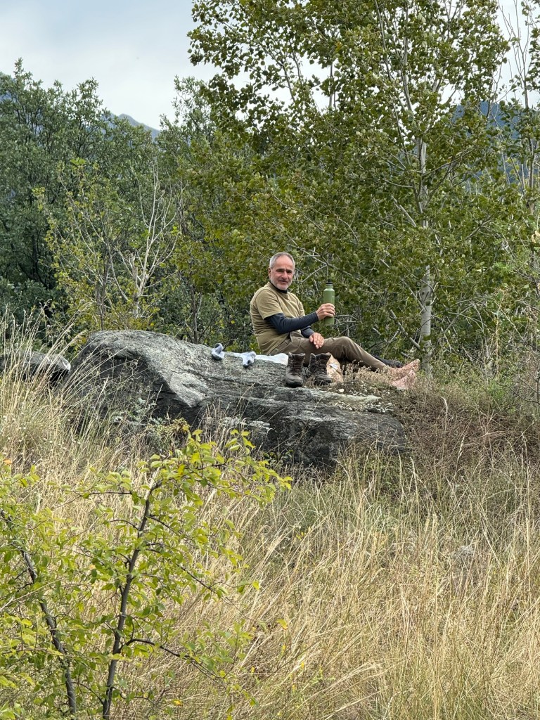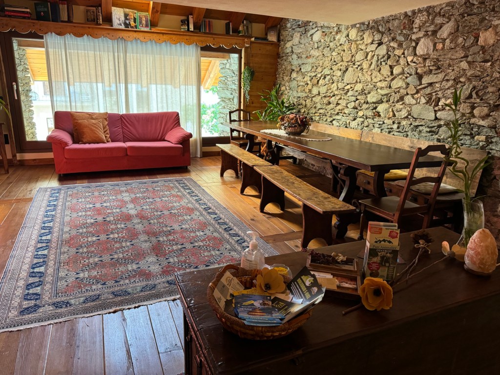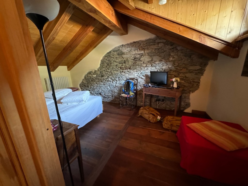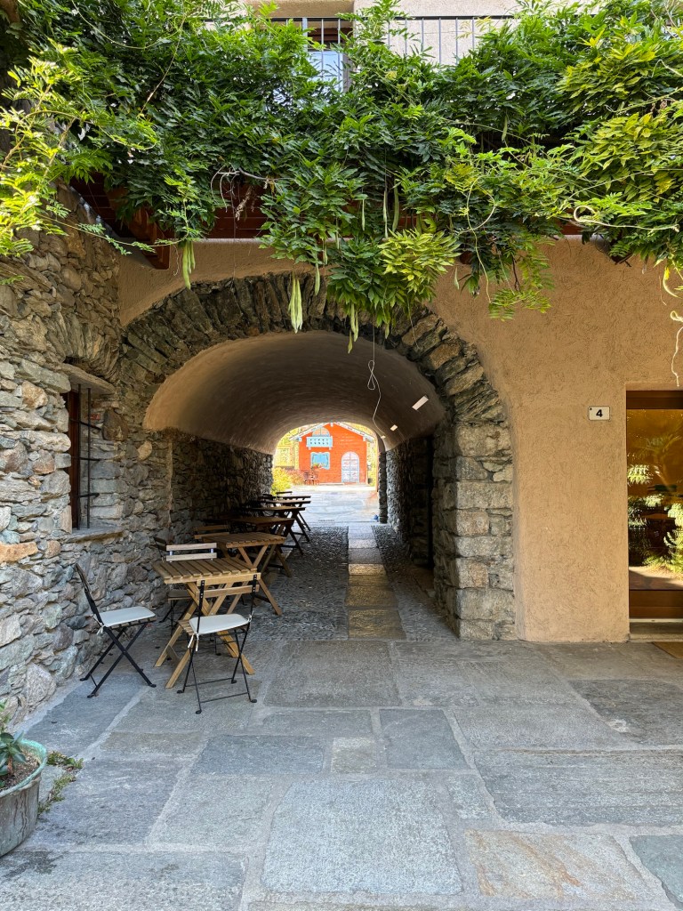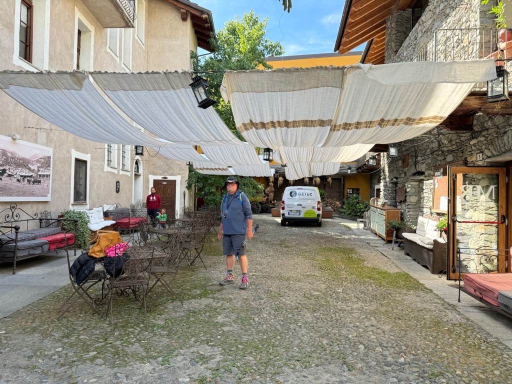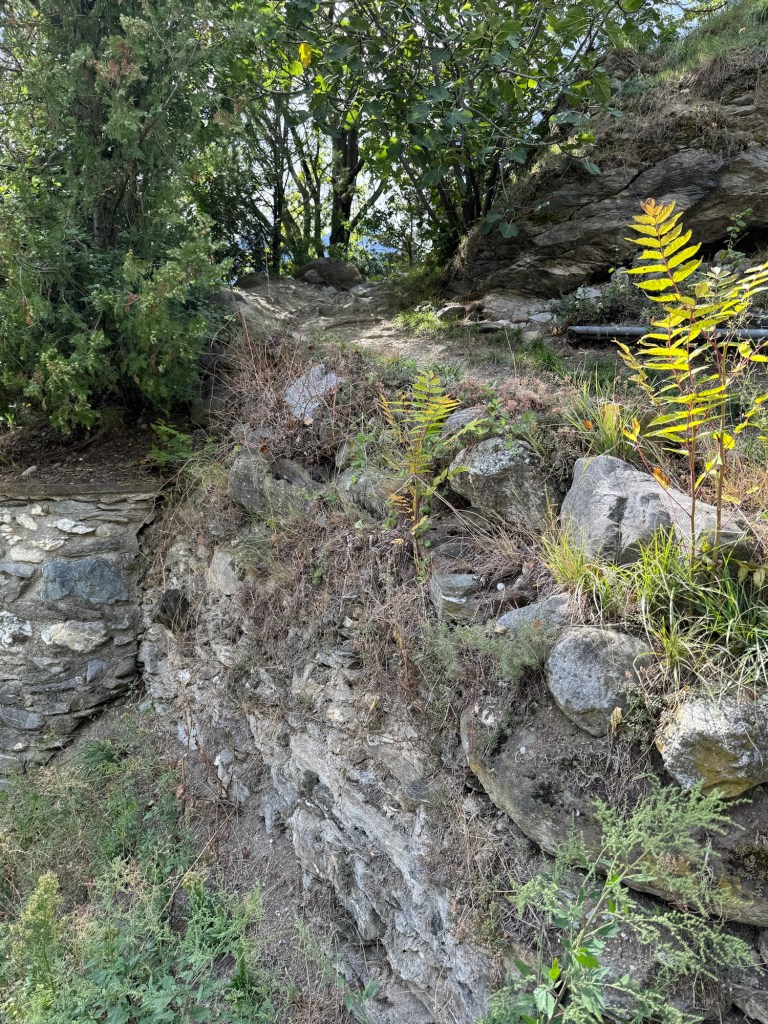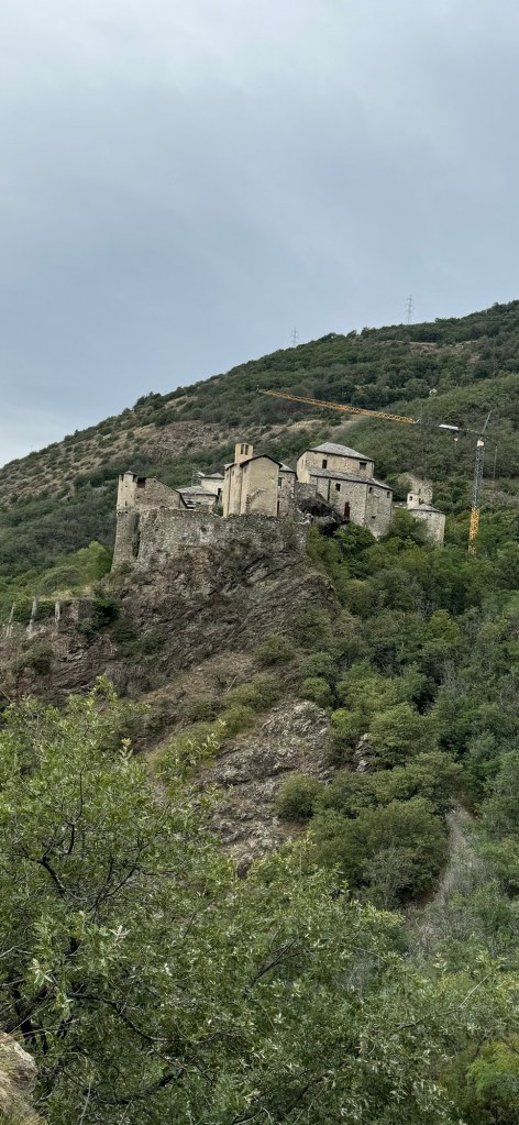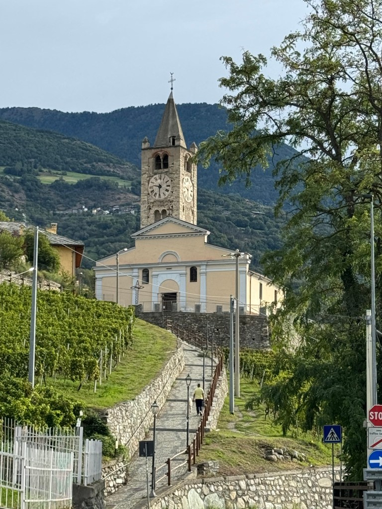 Steep ups and downs on the walk today but shorter, not as continuous as yesterday. A lot of walking beside the rus, ancient irrigation canals. One section of very very steep, twisty turns perilous downhill into Nus – lots of loose rocks. We were happy to have both hiking poles each. We picked our way down oh-so-carefully. Too focussed on getting down without breaking a leg or worse, a neck, to take pictures. This was the final section. The pic doesn’t really show the steepness.