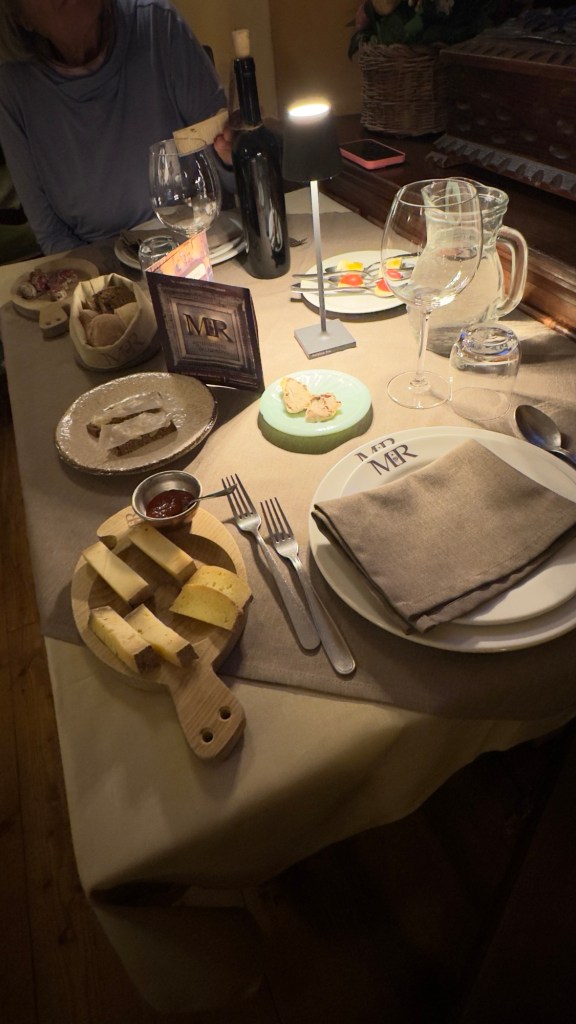 But first, dinner at the Agriturismo we stayed at. We signed up for dinner at 8, very late for us. But it was so worth it. We started with a table loaded with appetizers, all grown and produced on the property…pate, bread, cheeses, breads, wine….and more I can’t name.
