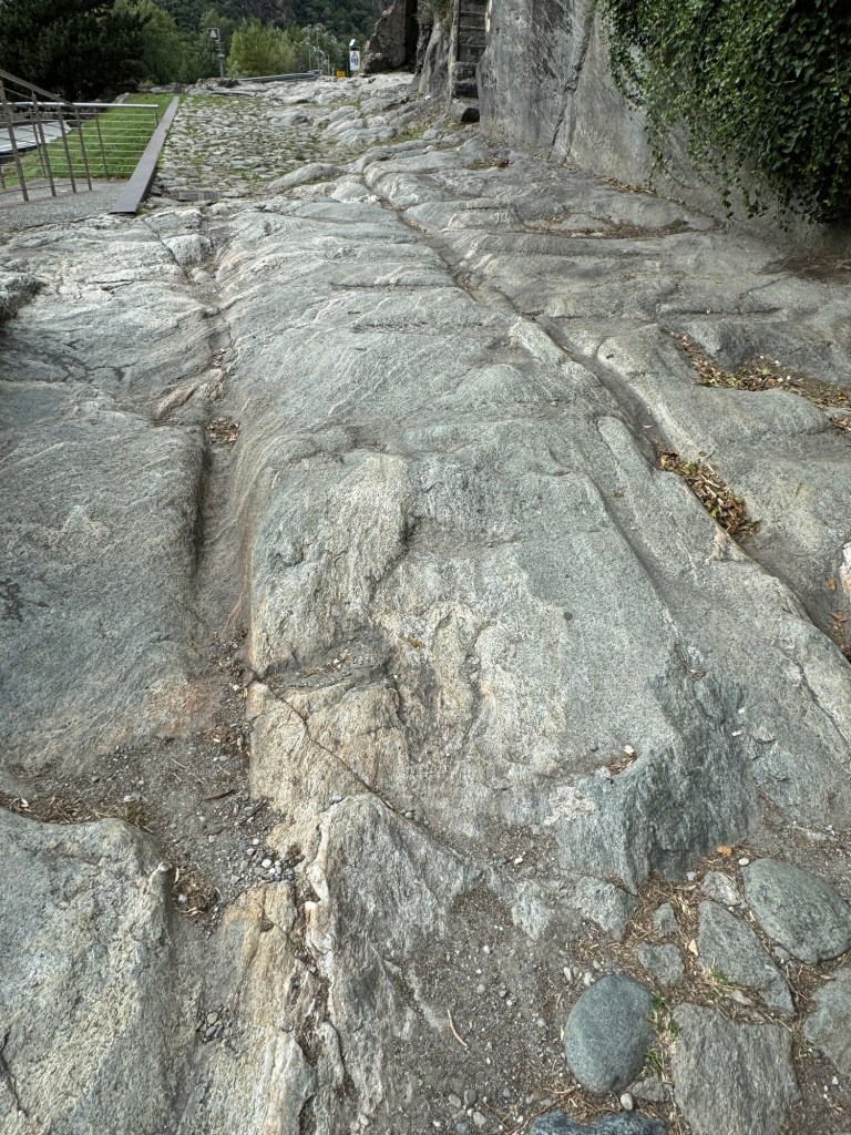 Next delight was discovering more ancient wagon tracks in the stone road as we walked into Pont St. Martin.