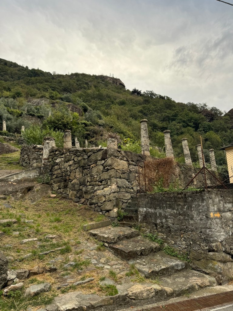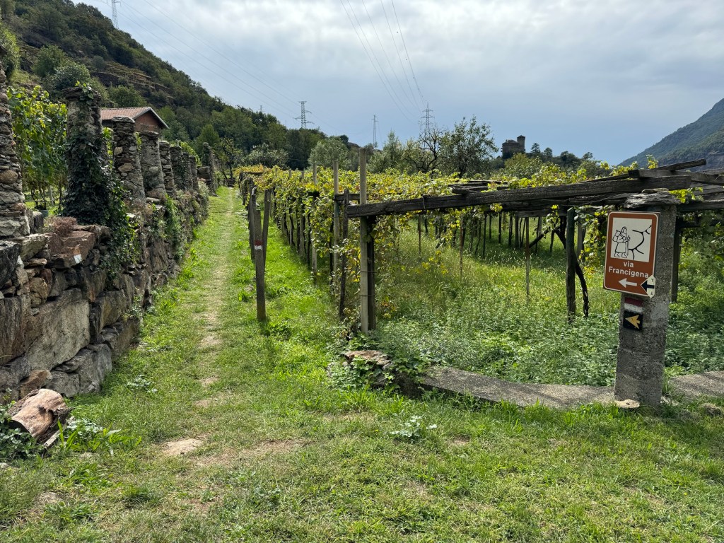 Pont St. Martin to Ivrea 24 km, 7 hours moving time. It was cloudy and cool with a bit of rain. Tough uphill scramble on hands and feet for me, that is, at the beginning of the walk but that was the worst. All day we passed through vineyards and small towns.
