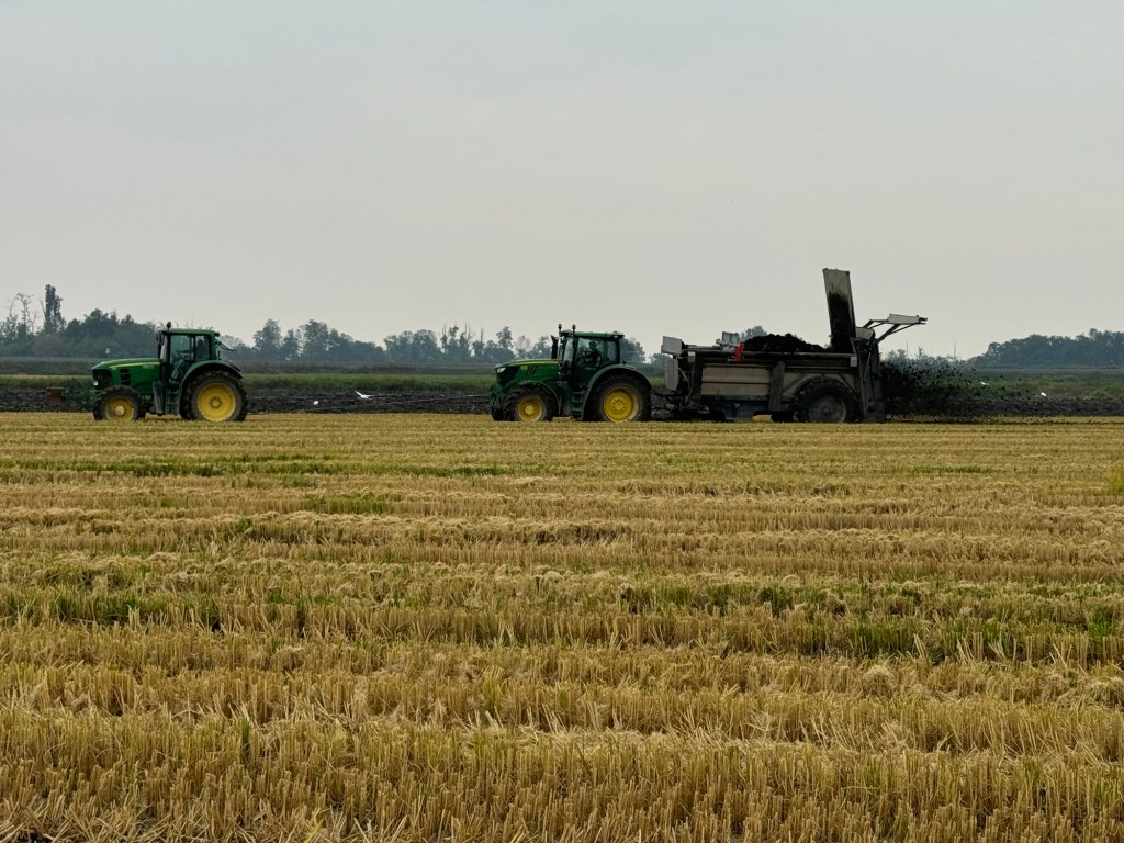 As we walked through field after field of rice, we were fascinated to see the process after the harvest. One tractor pulling another which was spreading manure followed by a cultivator, I’m guessing, which turned over the rice stems left over after the harvest.