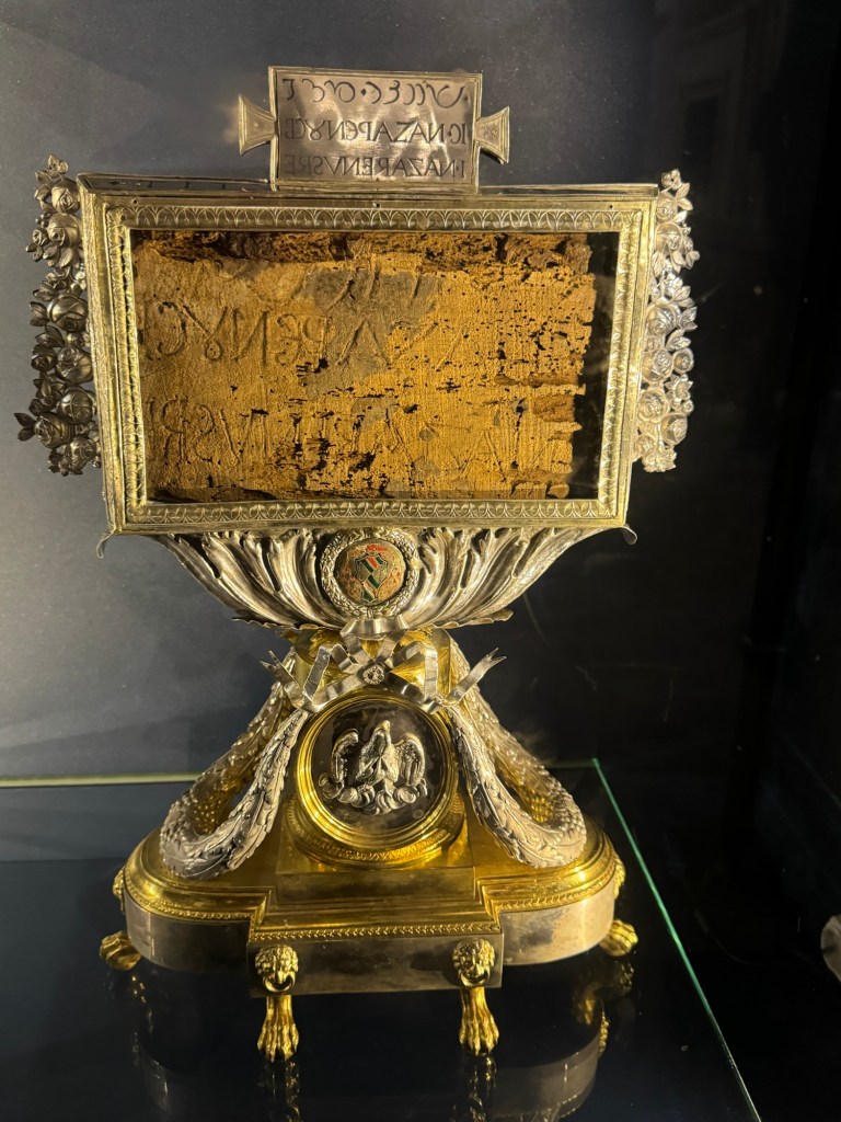 To the left is an aisle which leads to “La Cappella delle Reliquie”, the Chapel of Relics, relics of “the Passion of the Lord.” These relics have been kept for over a millennium, first in a semi-underground chapel dedicated to St. Elena and later, in 1570, moved to this basilica and a chapel built for them in the “Holy Year of 1925.” These relics are kept in “reliquaries” and are revered as some of the most sacred relics in Christian tradition. (I didn’t know any of this existed until the desk clerk at The Domus Sessorina Hotel-the Monastery-told us about it and we set off to find out more.) Absolutely fascinated I was.